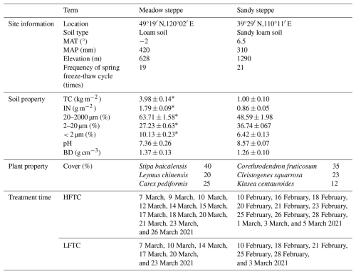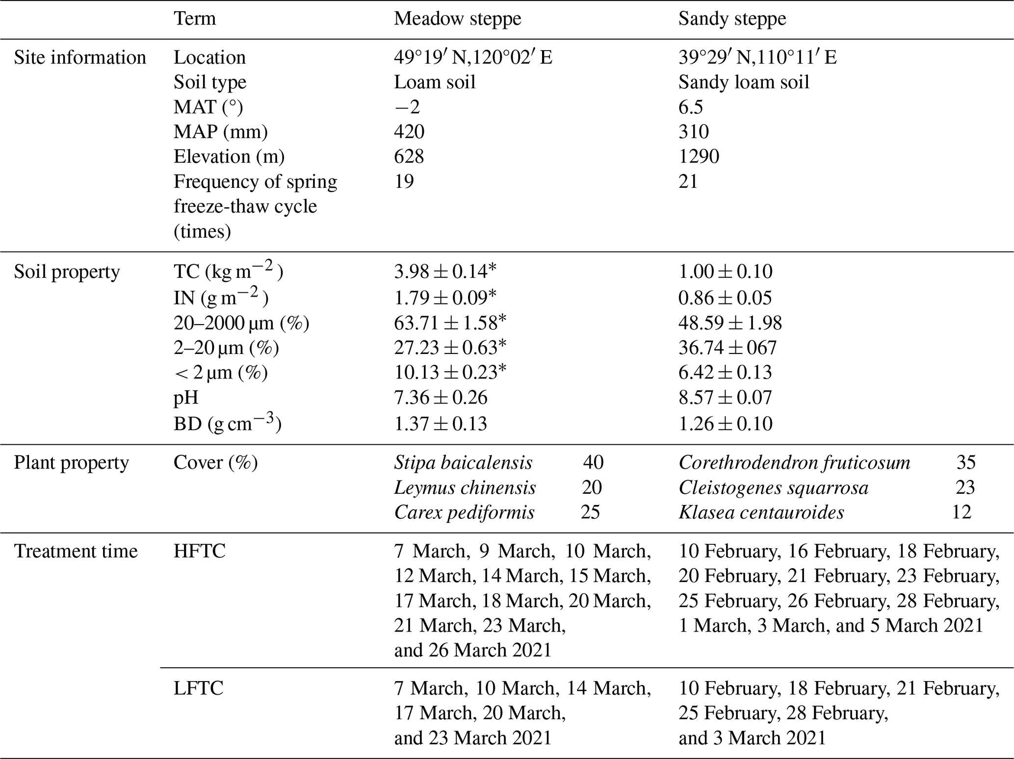 Both sites have a continental climate. The mean annual precipitation is 420 and 310 mm, and the mean annual temperature is −2 and 6.5 °C in the meadow steppe and the sandy steppe, respectively (http://data.cma.cn/, last access: 6 January 2021; https://www.ncei.noaa.gov/maps/hourly/, last access: 6 January 2021). The non-growing season for the meadow steppe extends from late September to late April of the following year, with a spring freeze-thaw period occurring from late March to late April. In contrast, the non-growing season for the sandy steppe lasts from mid-October to late March, with the spring freeze-thaw period occurring from late February to late March. During the study period, the meadow steppe had a persistent snow cover that reached a depth of 20–25 cm in late winter (January–February). In contrast, the sandy steppe exhibited shallower and more variable snowpack (typically 10 cm depth) due to higher wind redistribution and lower moisture retention. Under natural conditions, the meadow steppe in this study experienced a total of 19 freeze-thaw cycles, while the sandy steppe experienced 21 freeze-thaw cycles in early spring (http://nm.cma.gov.cn/, last access: 6 January 2021).