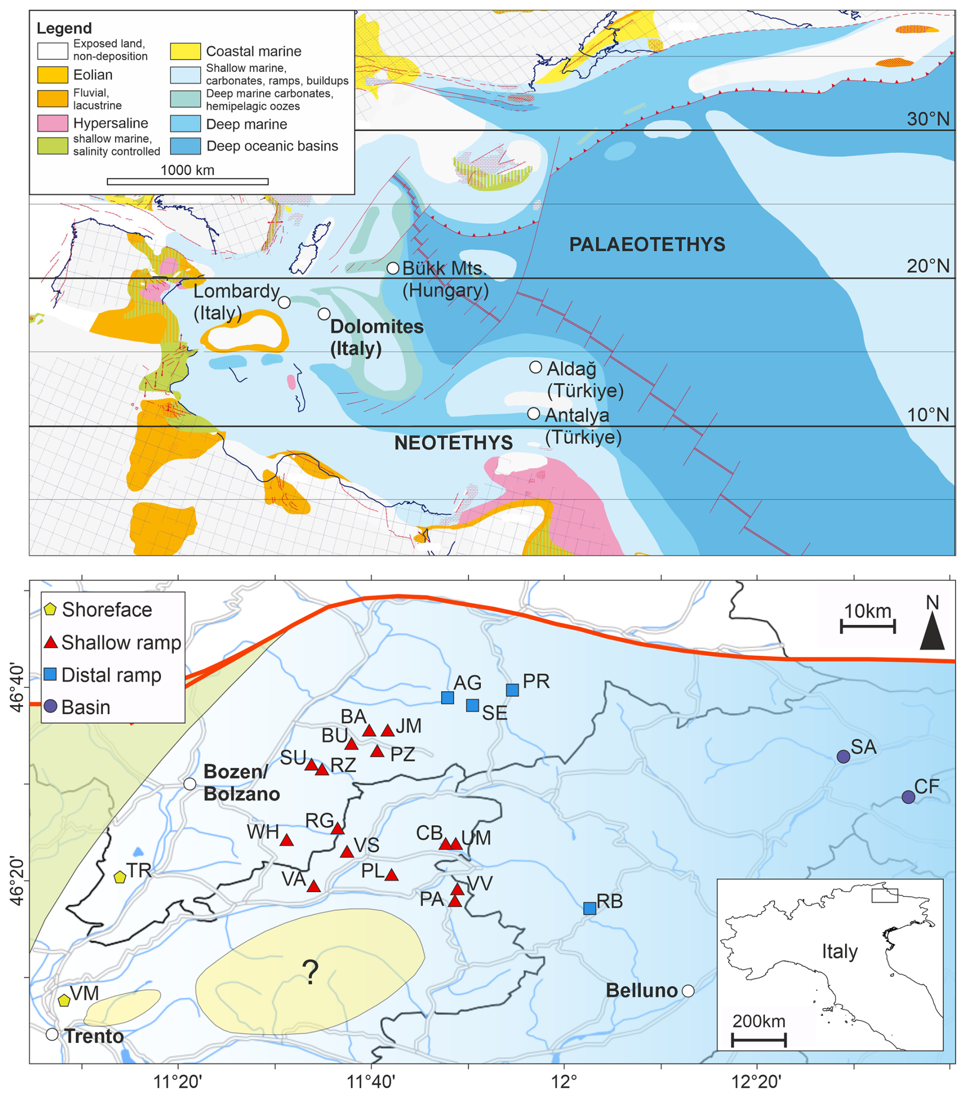 Figure 1Palaeogeographic setting of the Dolomites, Italy. Upper panel: Palaeogeographic map of the western Palaeotethys after the Ladinian reconstruction of Dercourt et al. (2000). The location of the Dolomites and other mentioned regions are indicated. Lower panel: The locations of the investigated sections from the Dolomites (Italy), overlain by a palaeodepositional map for the Permian/Triassic boundary emphasizing the onshore-offshore water depth gradient. Abbreviations: AG – Alferer Geisler, BA – Balest, BU – Pufels/Bulla, CB – Costabella, CF – Casera Federata, JM – Jmueia, PA – Punta Rolle, PL – , PR – Preroman, PZ – Ruf da Piz, RB – Rova-Baches, RG – Rosengarten/Catinaccio, RZ – Ratzes, SA – San Antonio, SE – Seres, SU – Seis/Siusi, TR – Tramin/Termeno, UM – Uomo/l'Om Picol, WH – Weißhorn/Corno Bianco, VA – Val Averta, VM – Vigo Meano, VS – Val Sorda, VV – Val Venegia. Note: the palaeocoastline and water-depths were dynamic during the Permian-Triassic transition and these figures are snapshots demonstrating the relative differences between the different localities.