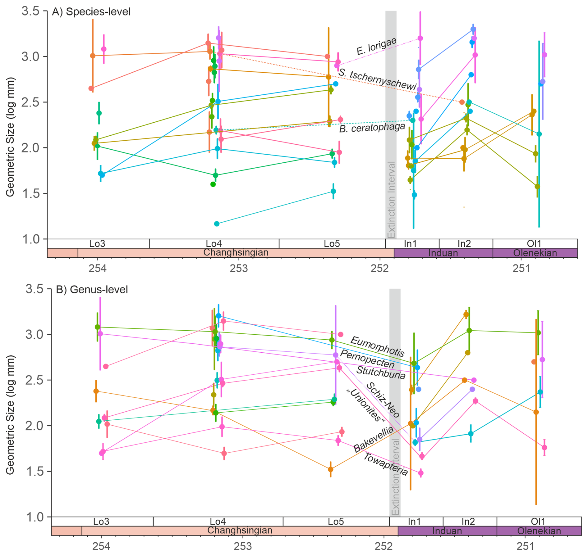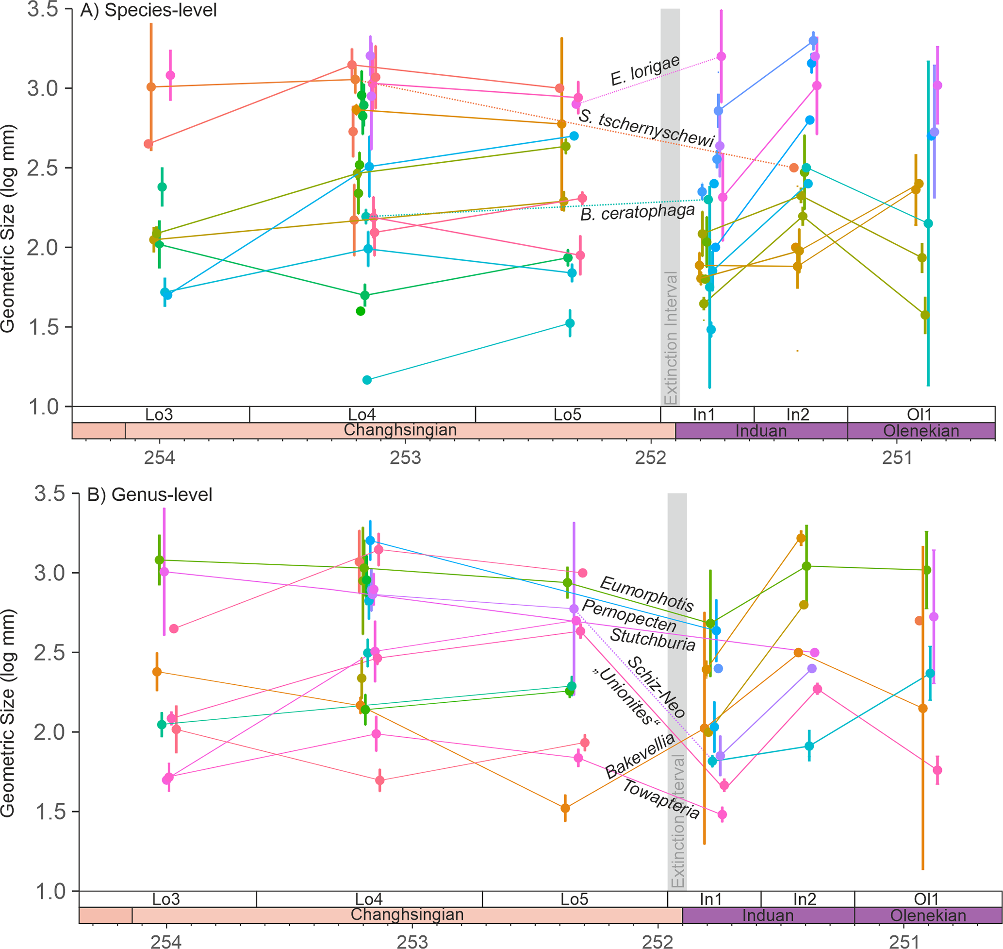 Figure 2Changes in the mean geometric size of bivalves from the Permian-Triassic transition in the Dolomites, Italy, with 95 % confidence intervals. (A) Body size changes at the species-level. The samples are grouped based on their sequence stratigraphic framework to reduce lithological biases on body sizes. Note: S. tschernyschewi is only considered an extinction survivor if the taxonomic reassignment of Stutchburia sp. B is accepted, see also the main text. (B) Body size changes at the genus-level. The closely related genera Schizodus and Neoschizodus are connected with a dotted line across the Permian/Triassic boundary. Schiz-Neo = Schizodus and Neoschizodus. Mann-Whitney U-tests of the significance in the body size changes are shown in Table S1 in the Supplement. The legend is shown in Fig. S1.