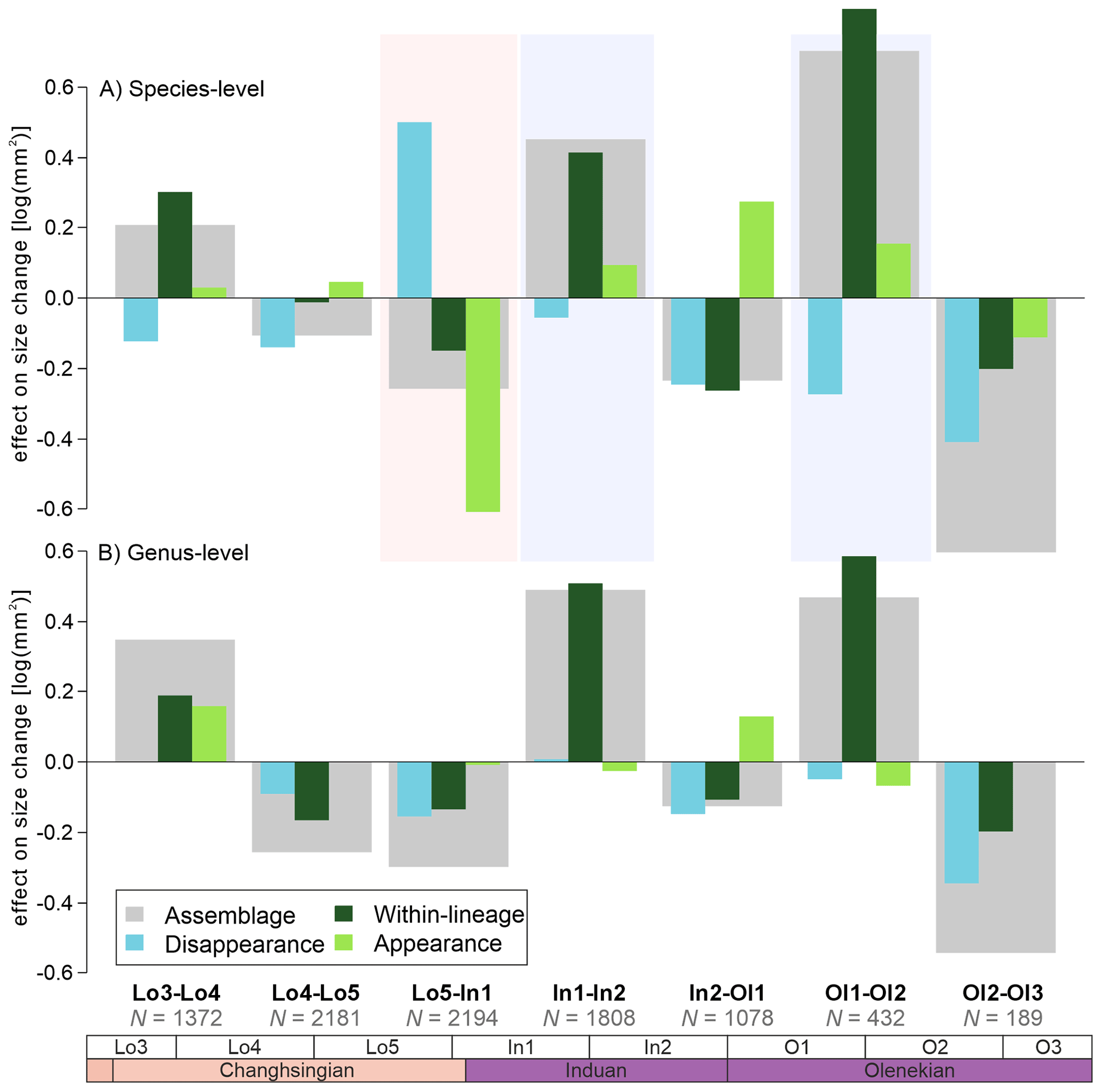 Figure 3The effect on body-size change on bivalve assemblages and the three components of body size change from the Dolomites, Italy. (A) The effects of body size changes at the species-level. (B) The effects of body size change at the genus-level. The number of observations based on each comparison are shown below each comparison. The effects of the Permian-Triassic mass extinction are shown between Lo5-In1.