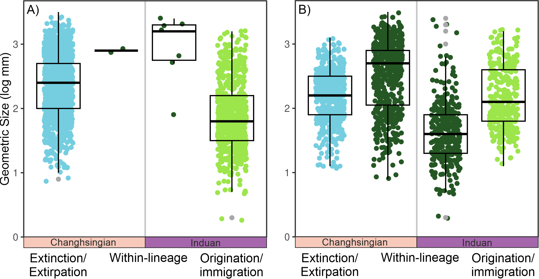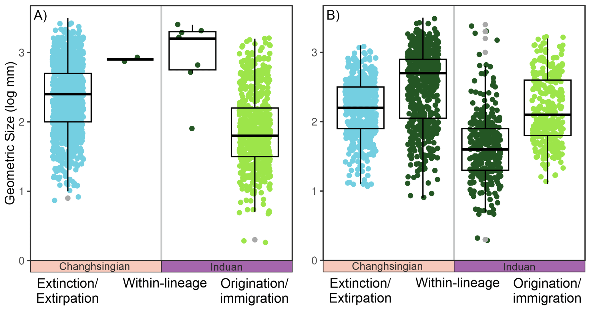 Figure 4The geometric body sizes of bivalves between Lo5 and In1 stratigraphic sequences, i.e., the impacts of the Permian-Triassic hyperthermal event, split into the three components of size changes from the Dolomites, Italy. The jitter plot shows the individual sizes of each measured bivalve specimen, with a box plot overlain. (A) At the species-level and (B) at the genus-level.