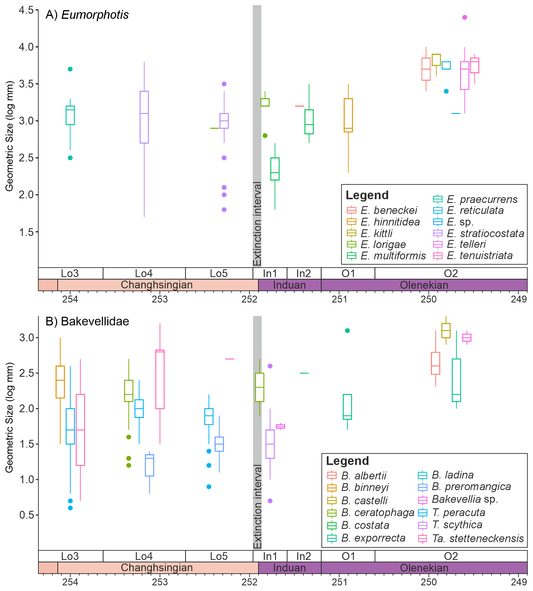 Figure 5Changes in the sizes of epifaunal/semi-infaunal bivalve genera that survive the mass extinction event. (A) Eumorphotis and (B) the Bakevellidae divided into the different species that were sampled from the Dolomites, Italy. The Bakevellidae include the genera Bakevellia (B), Towapteria (T) and Tambanella (Ta).