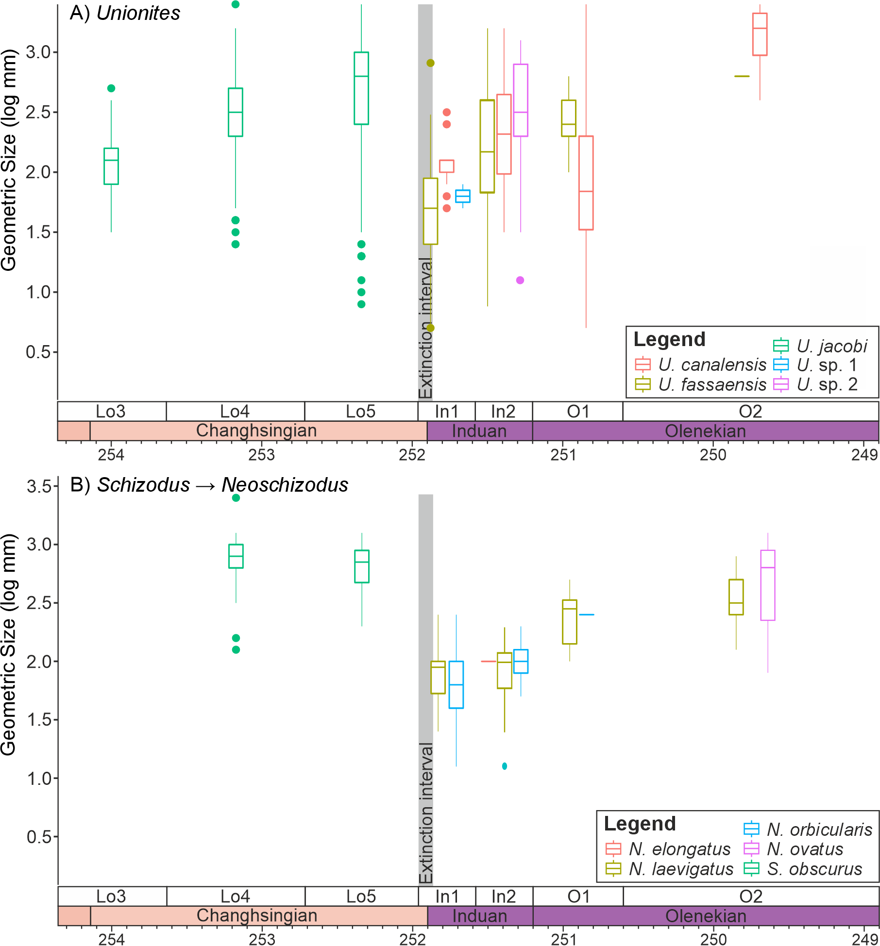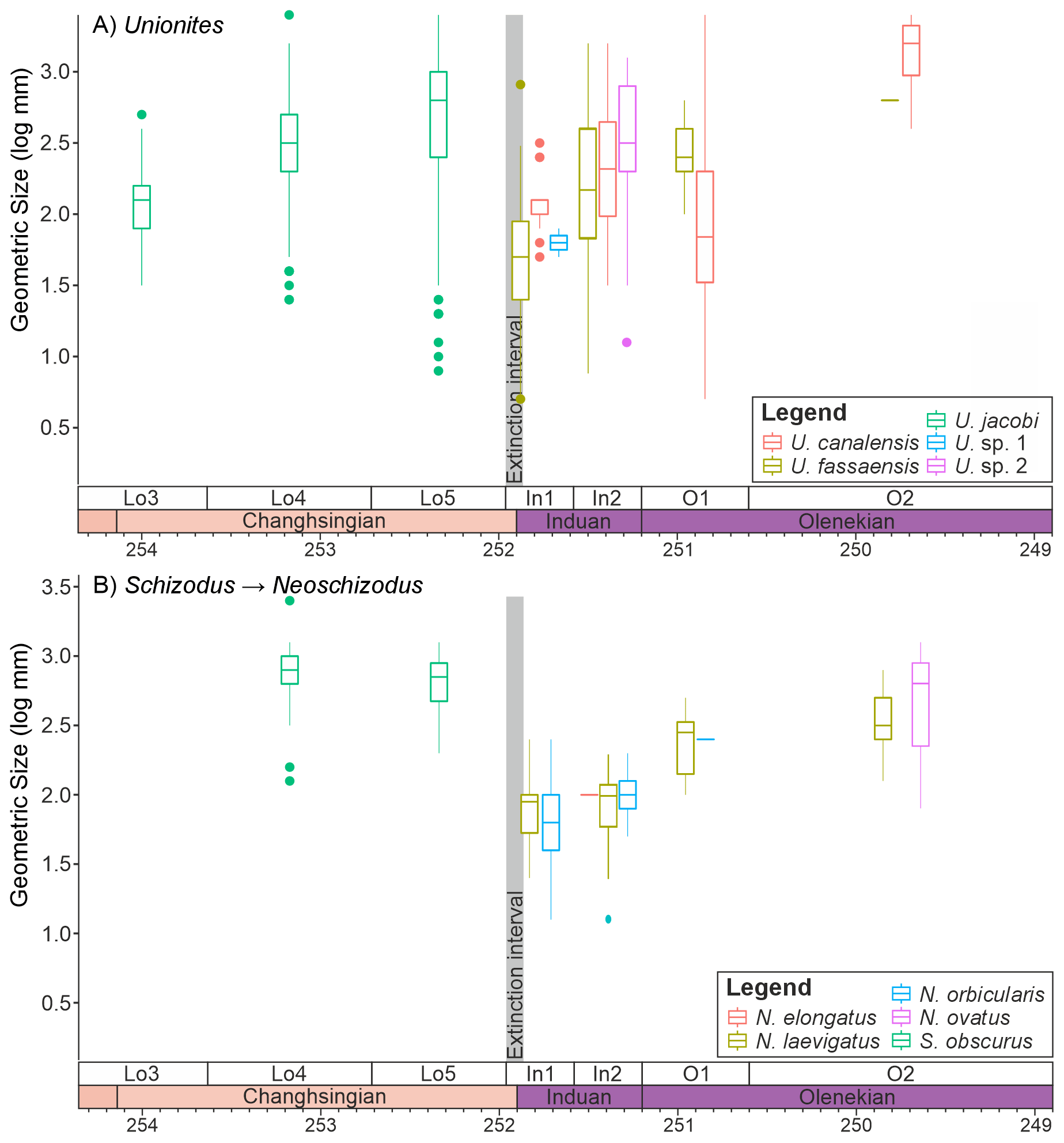 Figure 6Changes in the sizes of infaunal bivalve genera that survive the mass extinction event. (A) ”Unionites” and (B) the closely related genera Schizodus and Neoschizodus, divided into the different species that were sampled from the Dolomites, Italy.