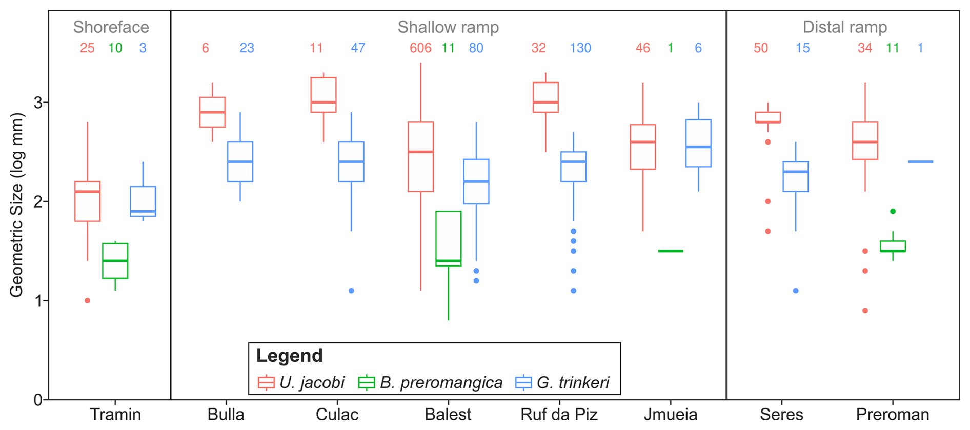 Figure 7Differences in the body sizes of three bivalves (Unionites jacobi, Bakevellia preromangica and Gardenapecten trinkeri) that appear in the Permian (pre-extinction) succession in all major environmental settings. The locations are organized according to their proximity to the coastline at the time of the Permian/Triassic boundary, see also Fig. 1.