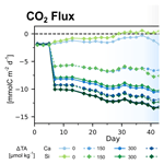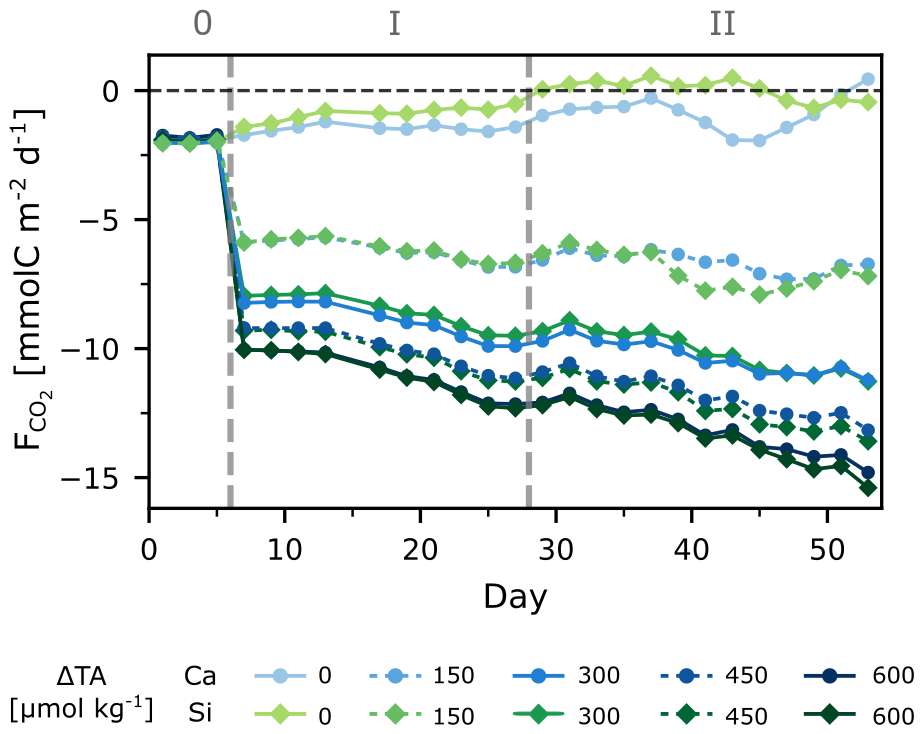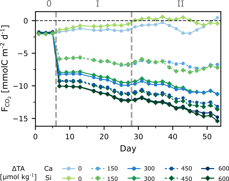 started at about −2 mmol m2 d−1, indicating that the system was already ingassing CO2 from the atmosphere during phase 0. This is related to the fact that the experiment was started during a post-bloom period, i.e., seawater pCO2 was lower than atmospheric levels, and the concentrations of dissolved inorganic nutrients were low. Furthermore, ingassing rates for the control treatments were within the range of natural air-sea flux estimates from the region (Aalto et al., 2021), indicating that the mesocosm setup did not hinder gas exchange during the experiment. After alkalinity addition, daily ingassing rates increased ( decreased) by a factor of 3–5 in the highest TA treatments (Fig. 2). The rates of daily ingassing continued to increase over time, even though the gradient between the atmosphere and seawater pCO2 would gradually decrease with atmospheric CO2 uptake.