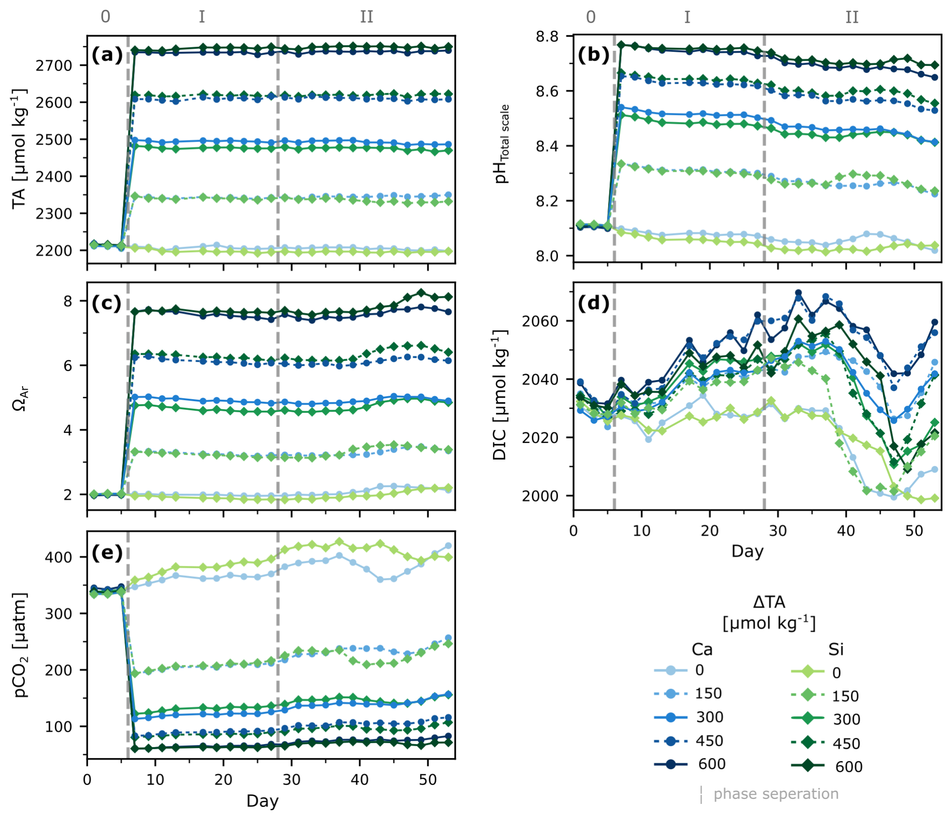 Figure 1Temporal development of carbonate chemistry parameters under different levels of non-CO2-equilibrated OAE. Depth-integrated measured TA (a), pHTotal scale at in-situ temperatures (b), and calculated aragonite saturation state (c), dissolved inorganic carbon (d), and partial pressure of carbon dioxide (e). Dashed lines and roman numbers denote the pre-treatment (0) phase and phases before (I) and after (II) nutrient addition.