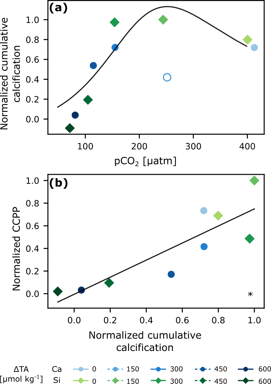 Figure 3Cumulative calcification (CALC) normalized (average of last 2 d) derived from carbonate chemistry parameters vs. pCO2 with optimum curve fitting (Eq. 9 in Gafar et al., 2018) (a), and normalized cumulative CaCO3 production potential (CCPP) vs normalized cumulative calcification (CALC) (b). The hollow circle was excluded from analysis. * p<0.05.
