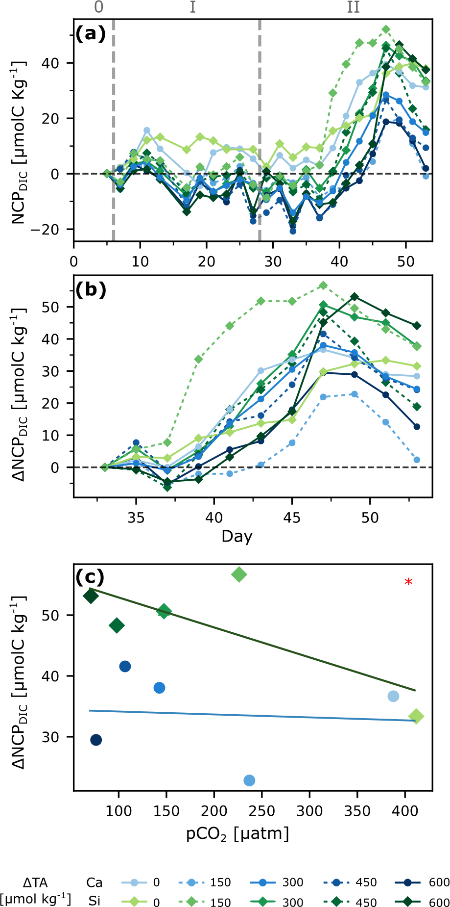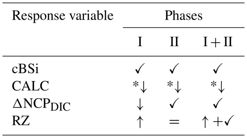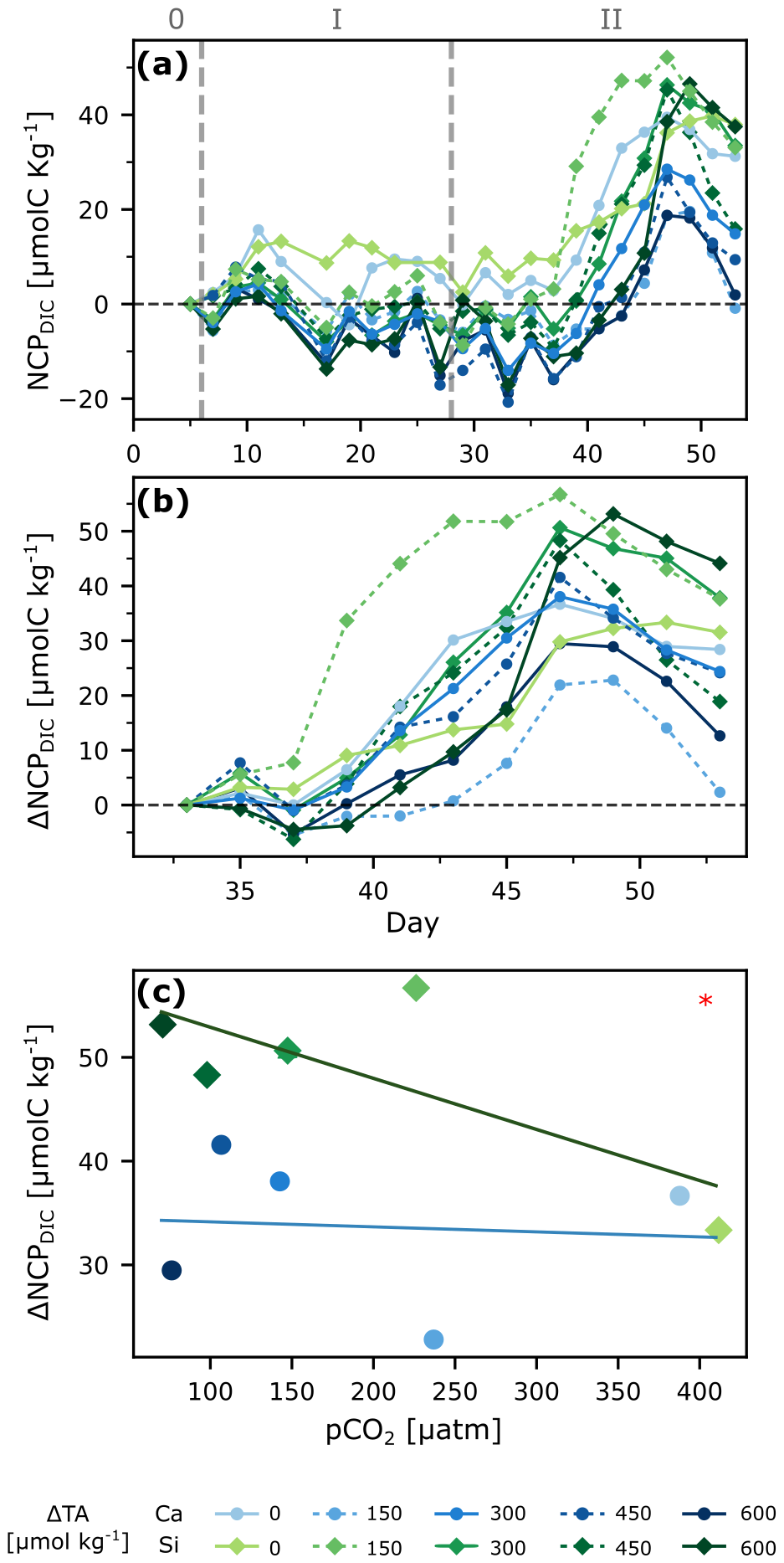 By accounting for the measured air-sea gas exchange, and factoring in the reductions caused by calcification, it is possible to isolate the change in DIC driven exclusively by biological activity such as photosynthesis and respiration (the NCPDIC). The in situ NCPDIC derived from cumulative changes in the DIC pool (Fig. 4a) encompasses autotrophic photosynthesis, decreasing DIC through the consumption of , and increasing DIC by both autotrophic and heterotrophic respiration. An increase in photosynthetic activity can be observed after the nutrient addition during phase II, as NCPDIC reached peak values, corroborated by the increase in Chl a (Fig. S1f). Furthermore, there appeared to be a general trend of silicate-based treatments reaching higher levels of NCPDIC than the calcium-based ones (Fig. 4c). This may be linked to the stoichiometry of inorganic nutrient availability. While in both treatments, nitrogen uptake was ∼3.6 µM in total. In the silicate-based treatments, silicate and nitrogen were consumed in a ratio of up to . In contrast, in the calcium-based treatments, the uptake ratio was reversed at , meaning that up to ∼10 times more silicate was drawn down in the silicate-based treatments within 20 d. This difference in uptake ratios was independent of the TA level, and thus likely driven by changes in diatom physiology and community composition, as discussed by Ferderer et al. (2024). Diatoms were likely Si-limited in phase 0, but could later allocate additional resources to growth (Inomura et al., 2023), potentially also explaining the higher measured NCP rates (Marín-Samper et al., 2024a) in the silicate-based treatments and, in turn, contributing to/causing the mineral effect detected here on NCPDIC.
