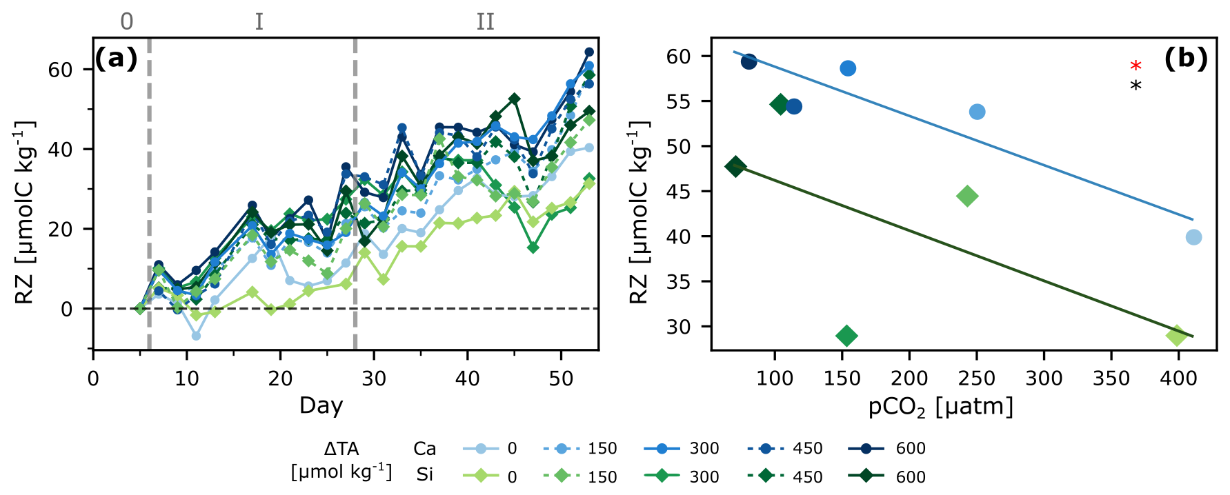 Figure 5Zooplankton under OAE. Respiration of Zooplankton and larger grazers (RZ) over time (a), and regression analysis of the entire span of the experiment as the last 2 d of cumulative change (averaged) vs. pCO2 (b). ANCOVA results: pCO2 (OAE treatment) effect: p<0.05 (black star), and mineral type effect: p<0.05 (red star).