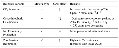 Table 1Phase-specific responses of key variables to pCO2 gradients and mineral type under non-CO2-equilibrated OAE. Symbols denote the dominant effect, with arrows depicting the direction of response to decreasing pCO2/increasing TA addition.