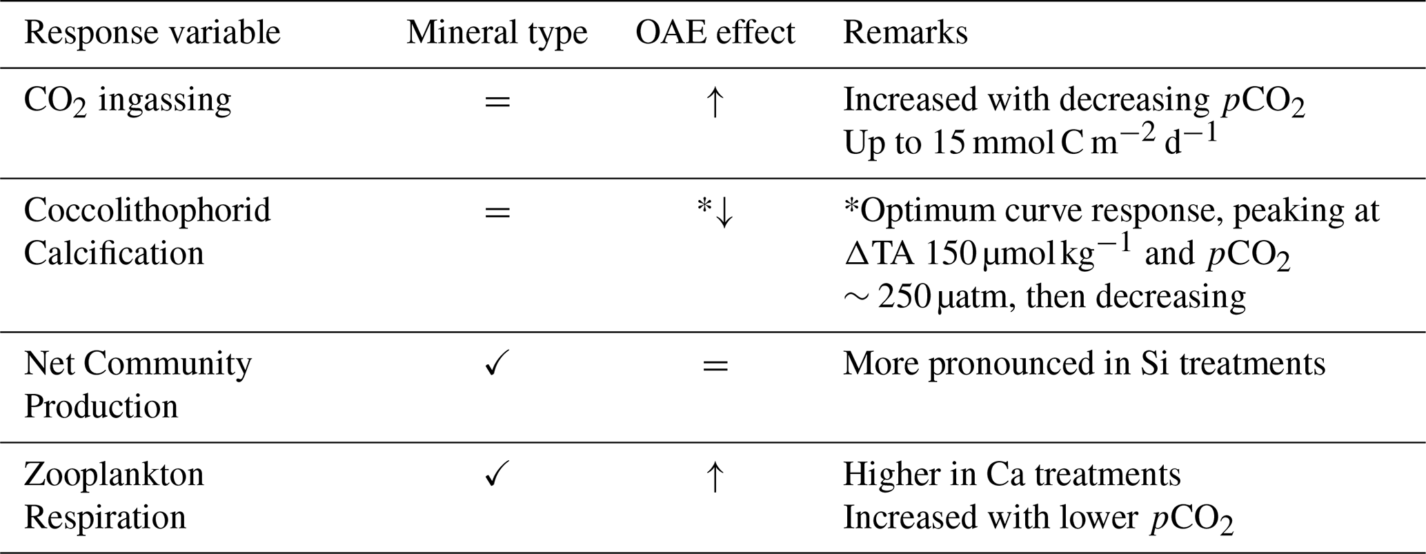 ✓ Mineral effect; *↓ Optimum curve; = No effect; CO2; pCO2+ Mineral (no interaction)