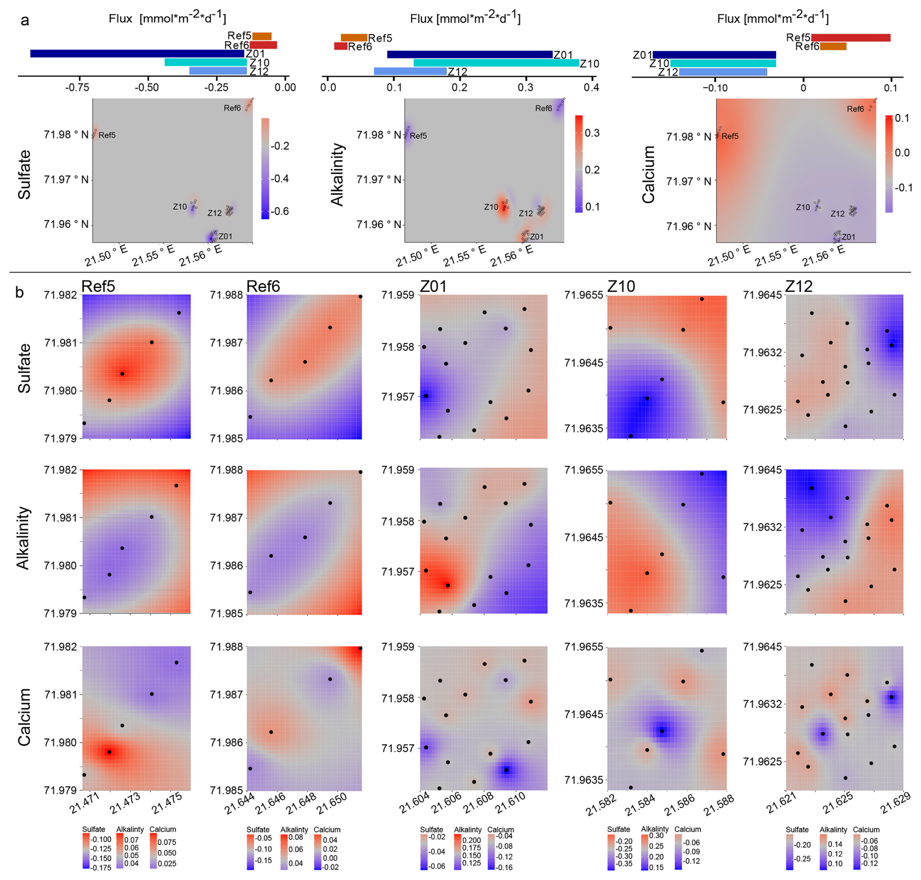 Figure 3Spatial variability and flux patterns of sulfate, alkalinity, and calcium across different zones. (a) Bar plots show the mean areal fluxes (mmol m−2 d−1 ) of sulfate (left), alkalinity (middle), and calcium (right) at the five zones (Ref5, Ref6, Z01, Z10, Z12). Kriging-interpolated maps illustrate the spatial distribution of these fluxes across the study area. Color gradients indicate the direction and magnitude of fluxes. (b) Detailed kriging maps of sulfate (top row), alkalinity (middle row), and calcium (bottom row) fluxes at each zone. Each column corresponds to one zone, showing localized spatial variability in solute fluxes. Black dots indicate the sampling sites.