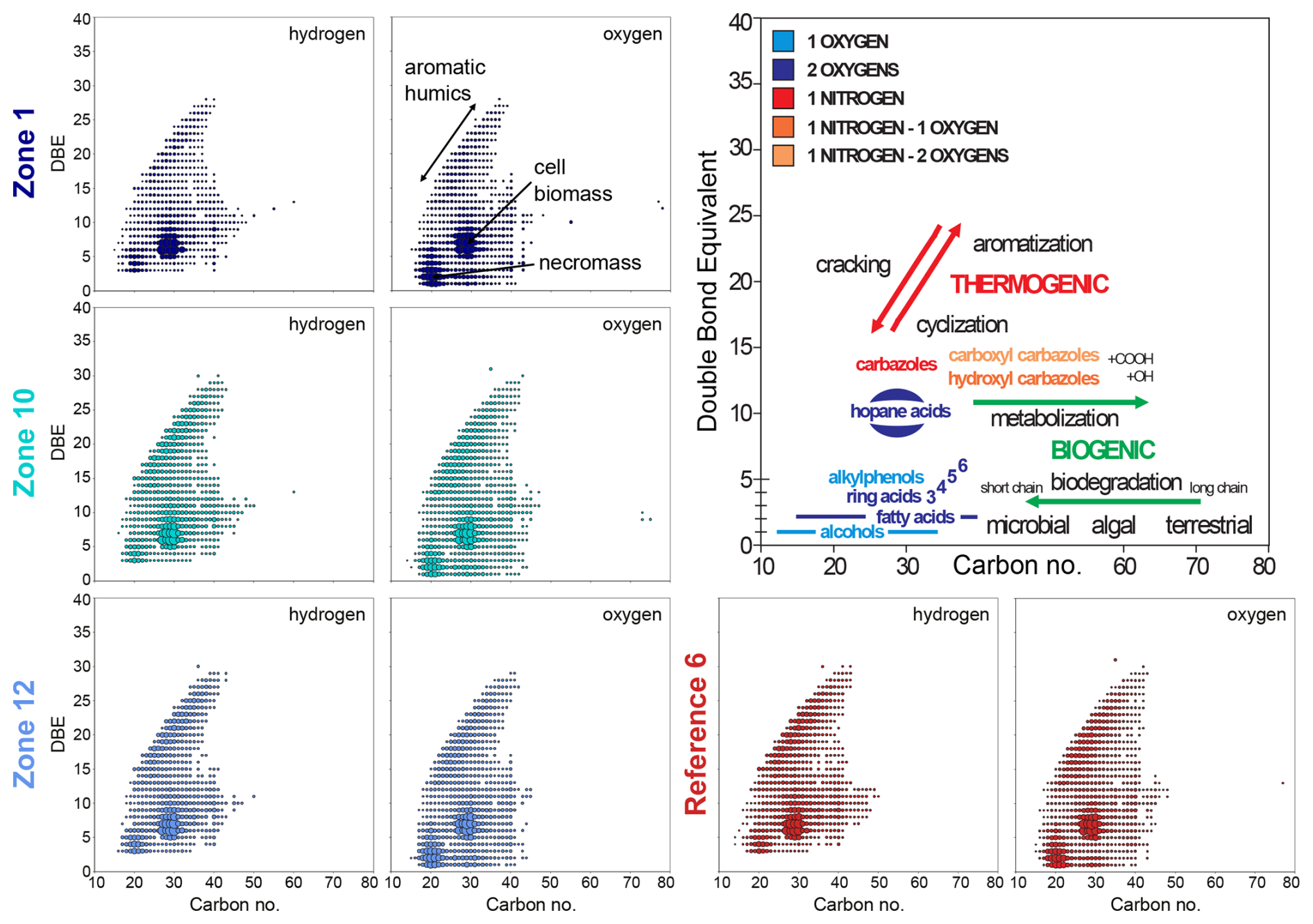 Figure 5Diagrams for molecular polar compounds identified by FT-ICR-MS in APPI+ mode in sediment extracts from the three hydrocarbon HC zones and one reference zone. (From left to right) Double bond equivalents (DBE) plotted against carbon number for compounds containing hydrogen and oxygen, and simplified interpretative framework of some molecular classes (e.g. aromatic acids, hopane acids, alkylphenols) and the expected shifts related to biogenic (e.g. microbial degradation) vs. thermogenic (e.g. cracking, aromatization) processes.