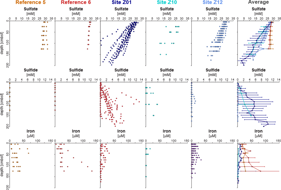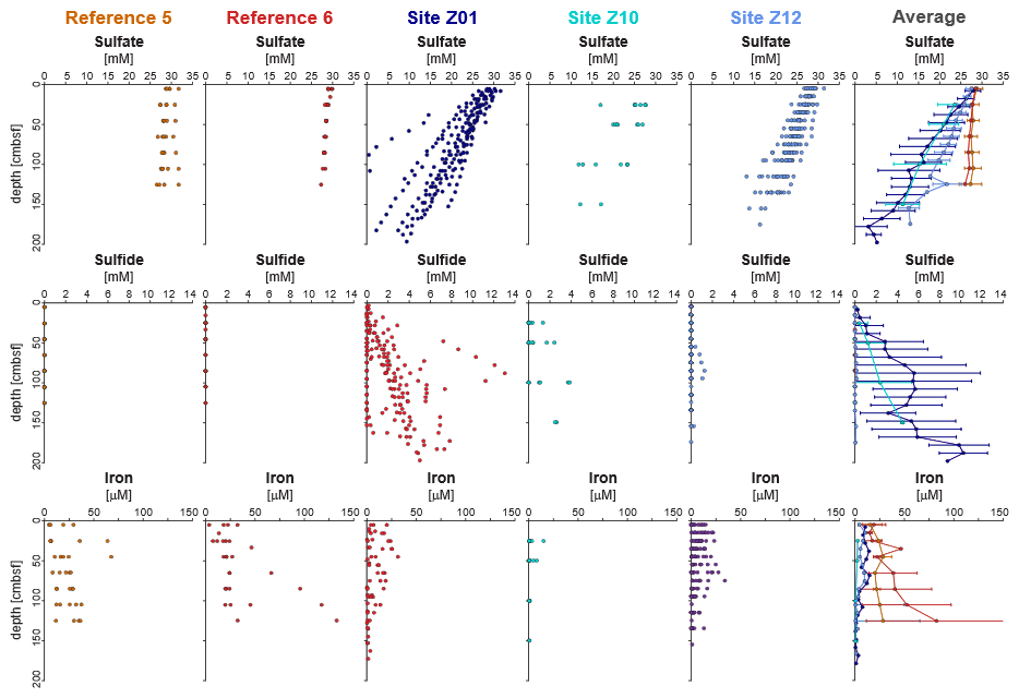 Figure 6Porewater profiles of sulfate, sulfide, and dissolved iron across five sites, including site averages. In seep-affected cores, iron concentrations decrease where sulfide increases, indicating removal of reactive iron through sulfide precipitation. Sulfate generally decreases with depth across all sites. Error bars represent site-specific averages where applicable.