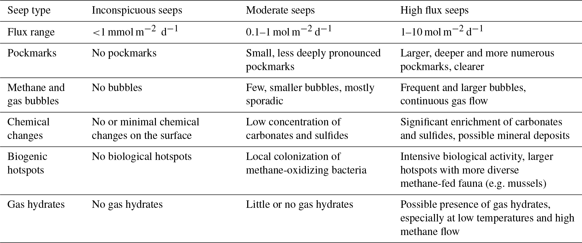 Table 1Classification of hydrocarbon seeps based on methane flux and associated surface manifestations. The table is compiled after (Judd and Hovland, 2009; Etiope, 2015). The flux range between inconspicuous- and moderate-flux seeps (1 to 100 mmol m−2 d−1) represents a conceptual transition zone, where current data are insufficient to establish a clear distinction.