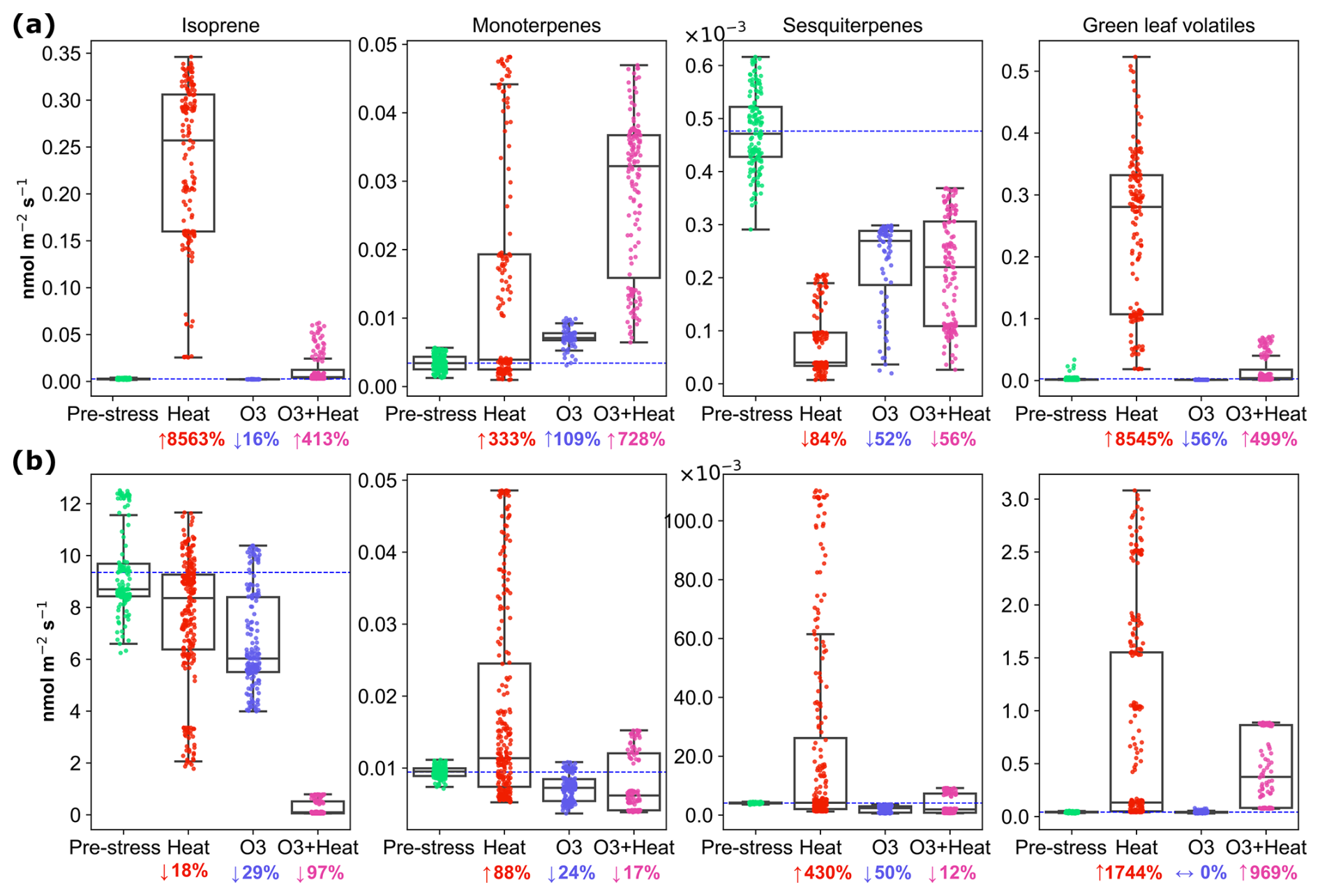Figure 2Emissions of isoprene, monoterpene, sesquiterpene, and green leaf volatile emissions from (a) beech and (b) oak under pre-stress, heat, O3, and combine stress (O3 + heat) conditions. Boxes represent interquartile ranges, horizontal lines indicate medians, and whiskers show the data spread. The dashed horizontal blue line represents the average pre-stress emission level for reference. Percent changes compared to average pre-stress levels are indicated by ↑ = increase, ↓ = decrease, ↔ = no change.