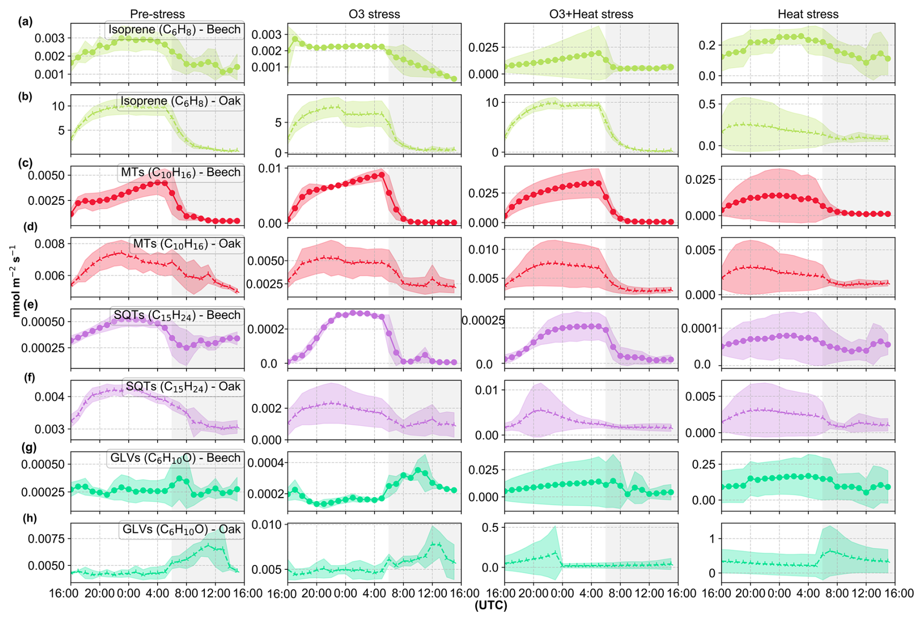 Despite oak being an isoprene emitter and beech a non-isoprene emitter, both species showed similar responses (in pattern or diel variation) to heat and ozone stress, although with different magnitudes (Fig. 3). In oak, heat was applied after ozone, while in beech, heat followed the combined stress, yet the main stress-induced emission patterns were consistent across species.