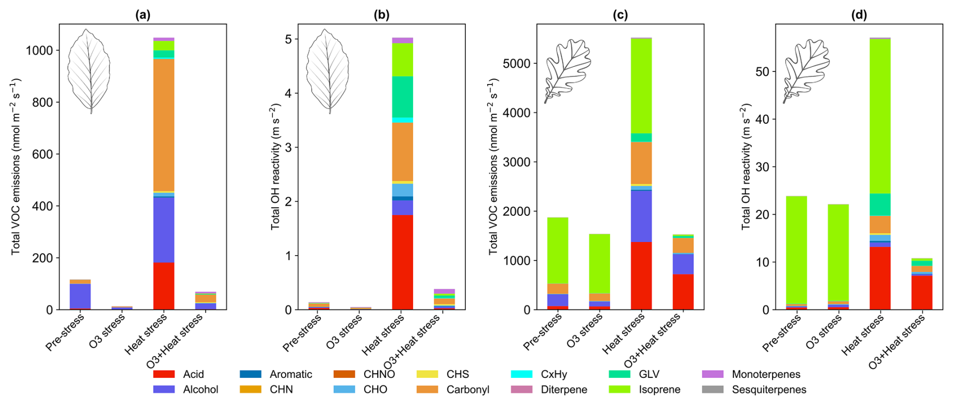 OH reactivity was much higher under heat stress rather than combined ozone and heat stress in both species with different magnitudes. Isoprene dominated OH reactivity emitted from oaks under pre-stress and O3 stress but not heat and combined stress. In beech, heat stress led to OH reactivity dominated by carbonyls (∼ 25 %, mainly acetaldehyde), acids (∼ 27 %, primarily acetic acid), and alcohols (∼ 20 %, mostly methanol), with isoprene (∼ 12 %). When ozone was added on top of heat as a co-stressor, the profile was altered, carbonyls increased to ∼ 30 % (now including more acetone), alcohols remained stable (∼ 20 %), and with more monoterpenes (∼ 20 %) contributions. However, oak showed a different pattern: under heat stress, OH reactivity was driven mainly by isoprene (∼ 56 %) and acids (∼ 23 %, acetic acid). With combined additive (ozone-heat) stress, there was a shift towards the acid group ∼ 66 % and carbonyls to ∼ 14 % (notably hexenal and acetaldehyde), while isoprene dropped to just ∼ 4 %.