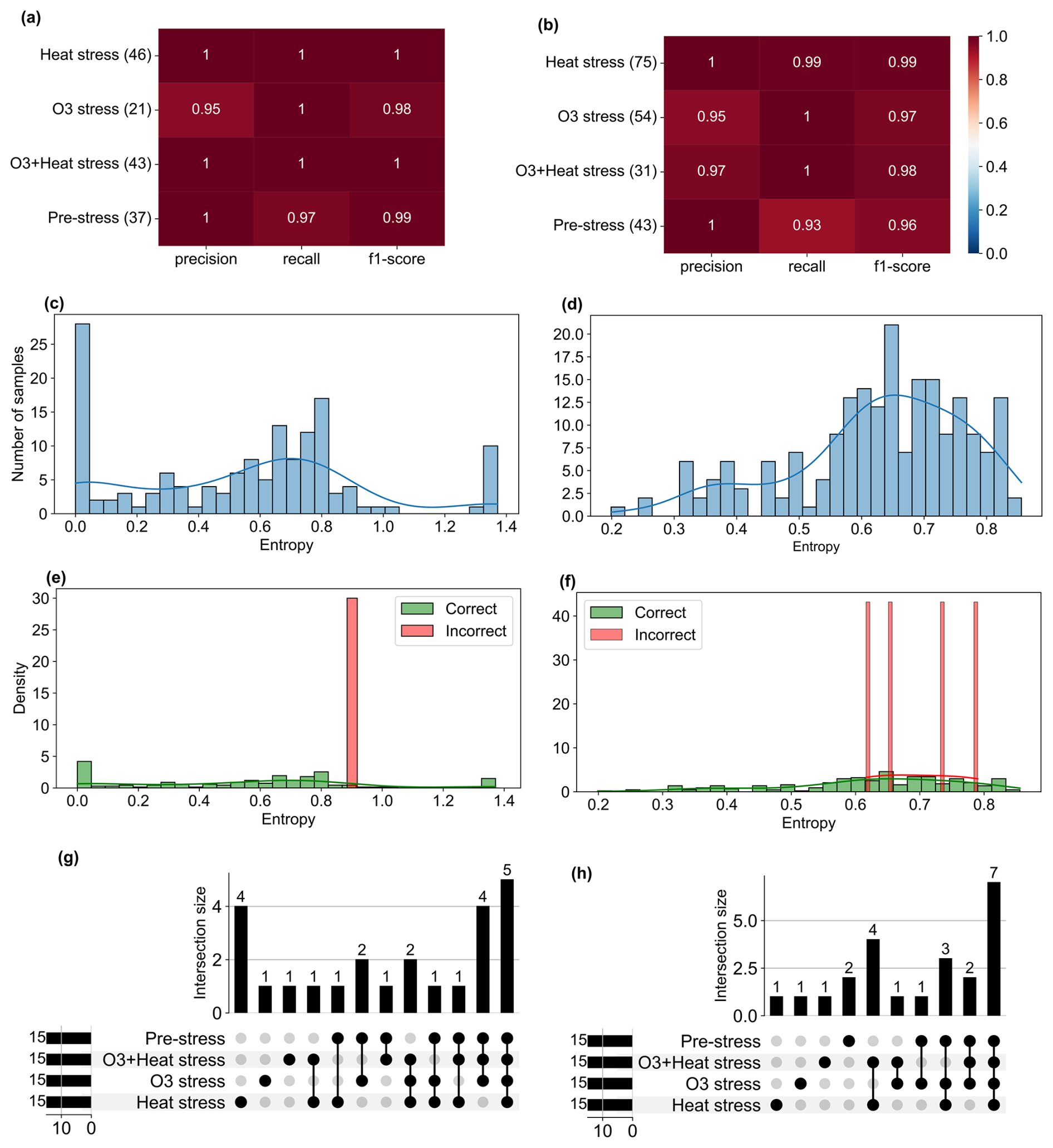 To further assess the relationship between uncertainty and misclassification, entropy distributions were compared between correctly and incorrectly classified samples (Fig. 6e–f). Incorrect predictions were generally associated with comparatively high entropy, confirming that the entropy well captured classification uncertainty rather than random variability. Also, no random entropy spikes were observed across conditions, supporting the model's stability. In addition, the time series entropy (see Figs. S5d and S6d) showed that most classifications were made with high certainty (entropy < 0.6), though slight increases occurred under combined O3 + heat stress, potentially reflecting overlapping BVOC patterns and the model's sensitivity to complex stress signals. Performance stability was also checked across classes; bootstrapped distributions of classification scores with low variance (Figs. S5e–f, S6e–f) indicate the model's consistency. These evaluations confirmed that trained models are useful in classifying stress types.