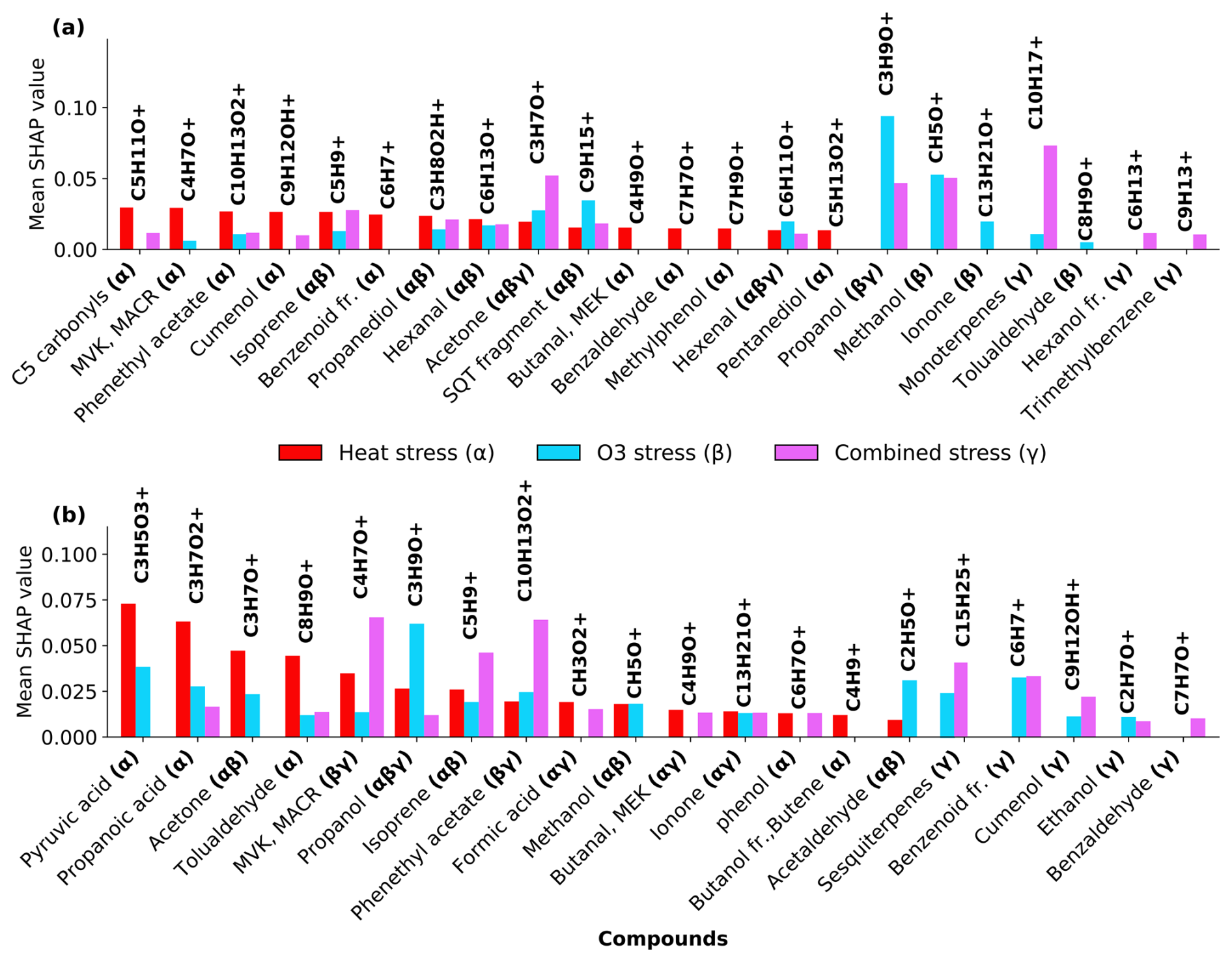 Results from PMF (top 15 compounds) and ML-based SHAP (top 15 compounds) analyses were integrated as cross-investigation for comprehensive fingerprint identification. Taken together, the integration of PMF and SHAP results extends the understanding of VOC emission tracers under stresses shown in Sect. 3.6.