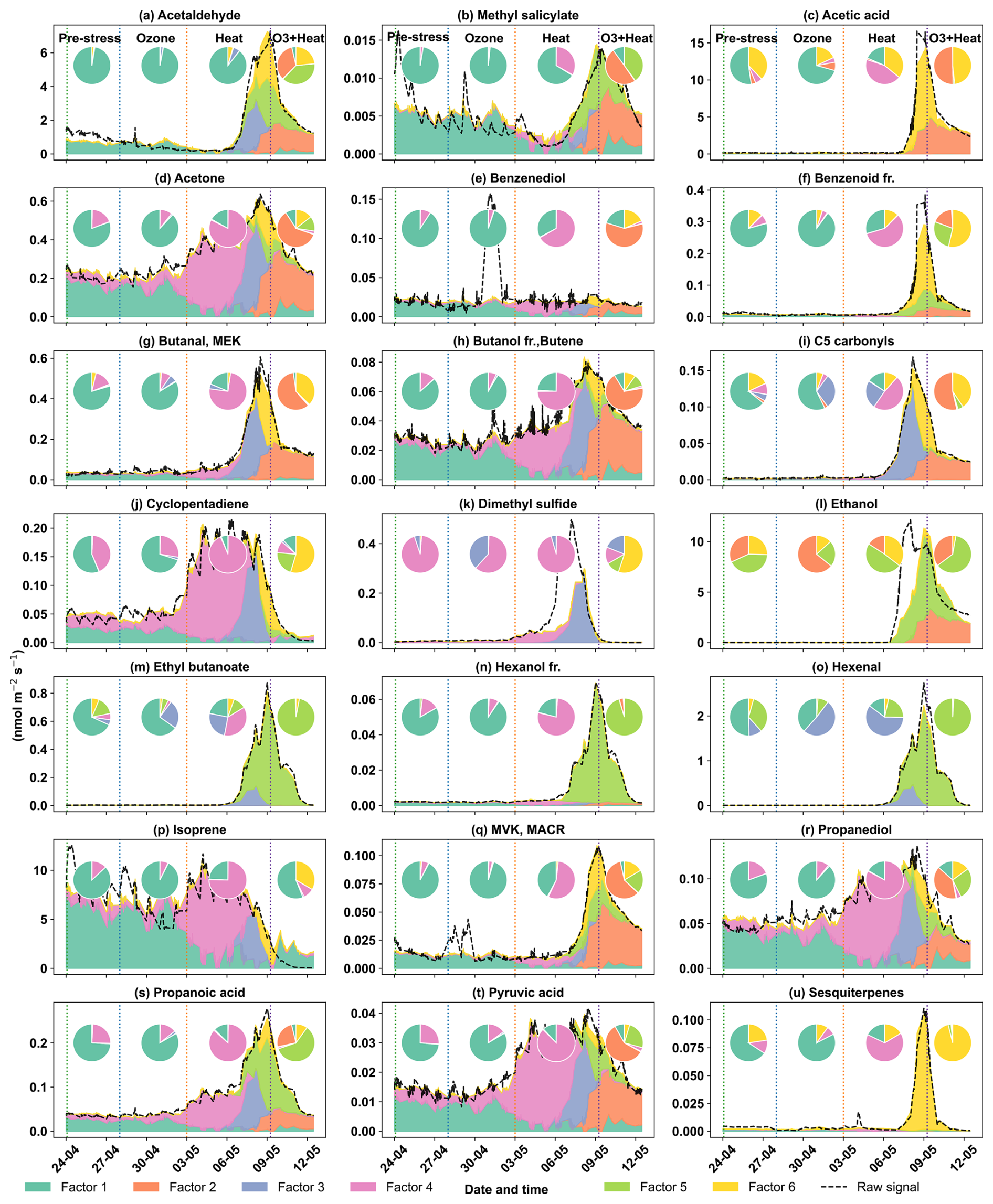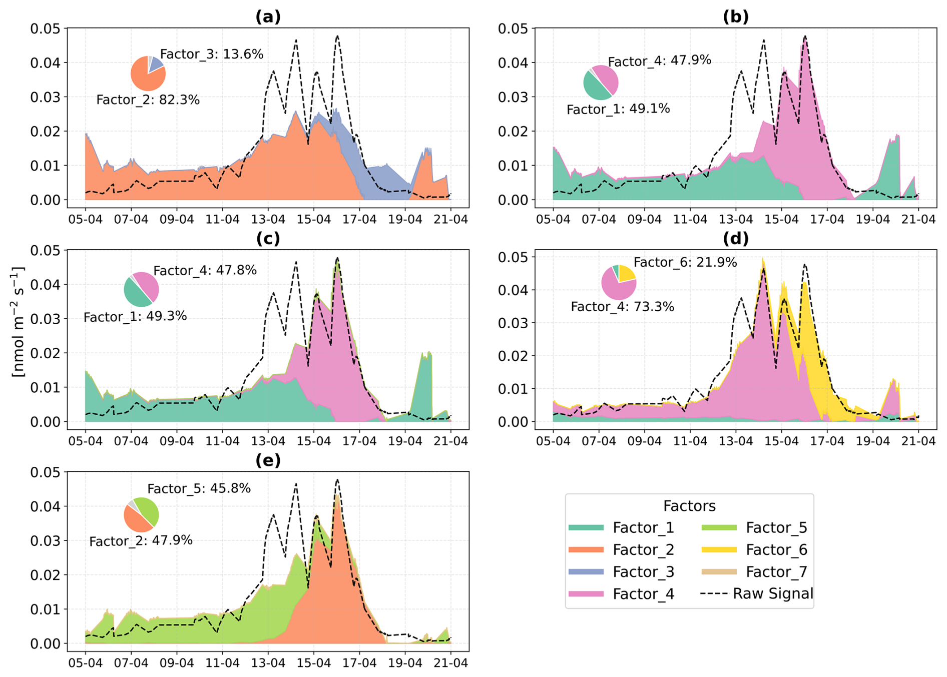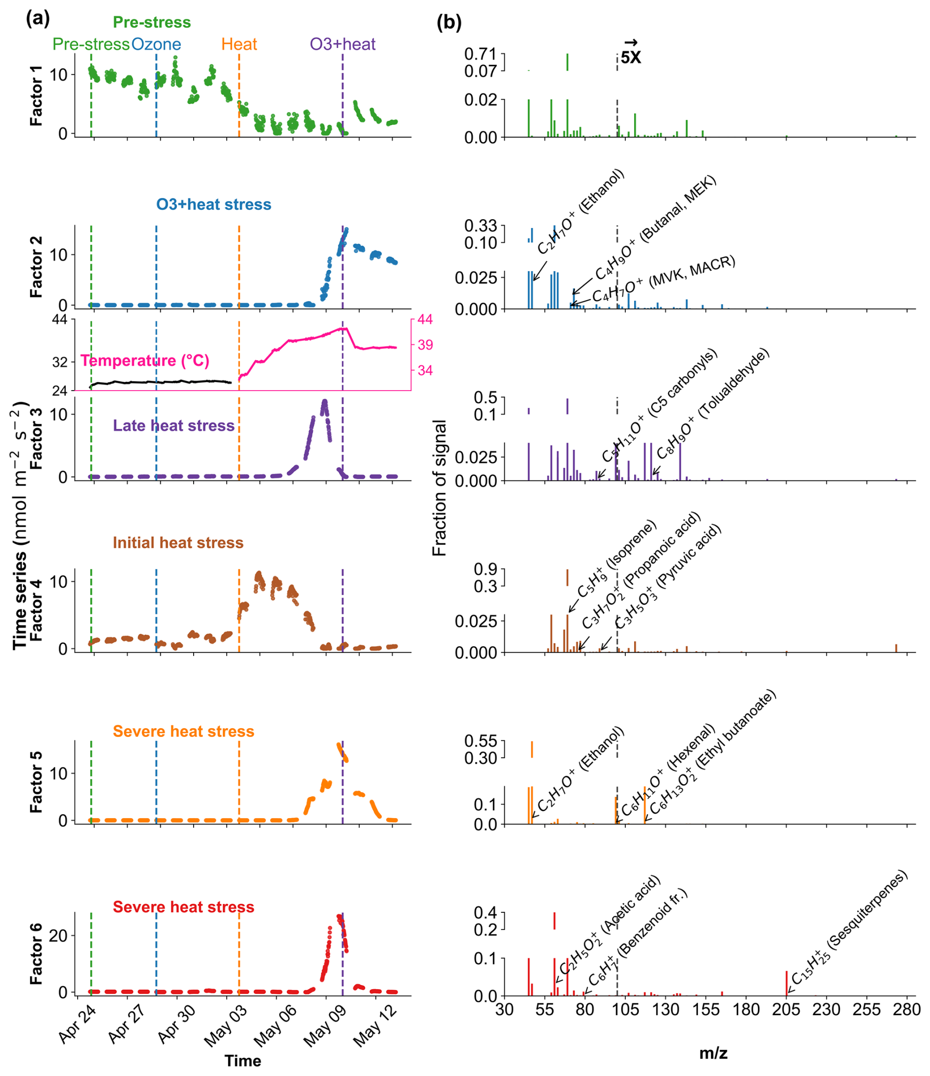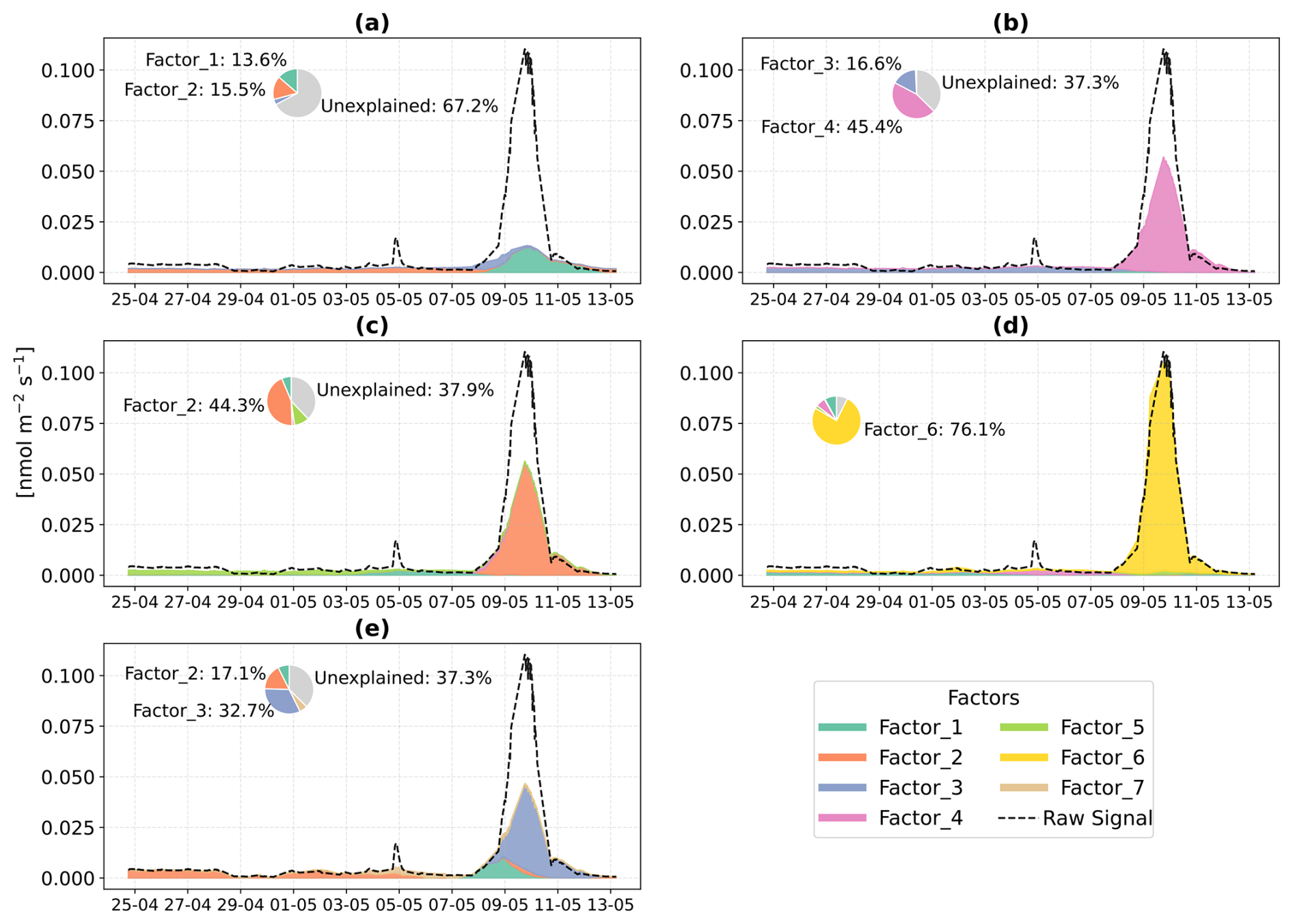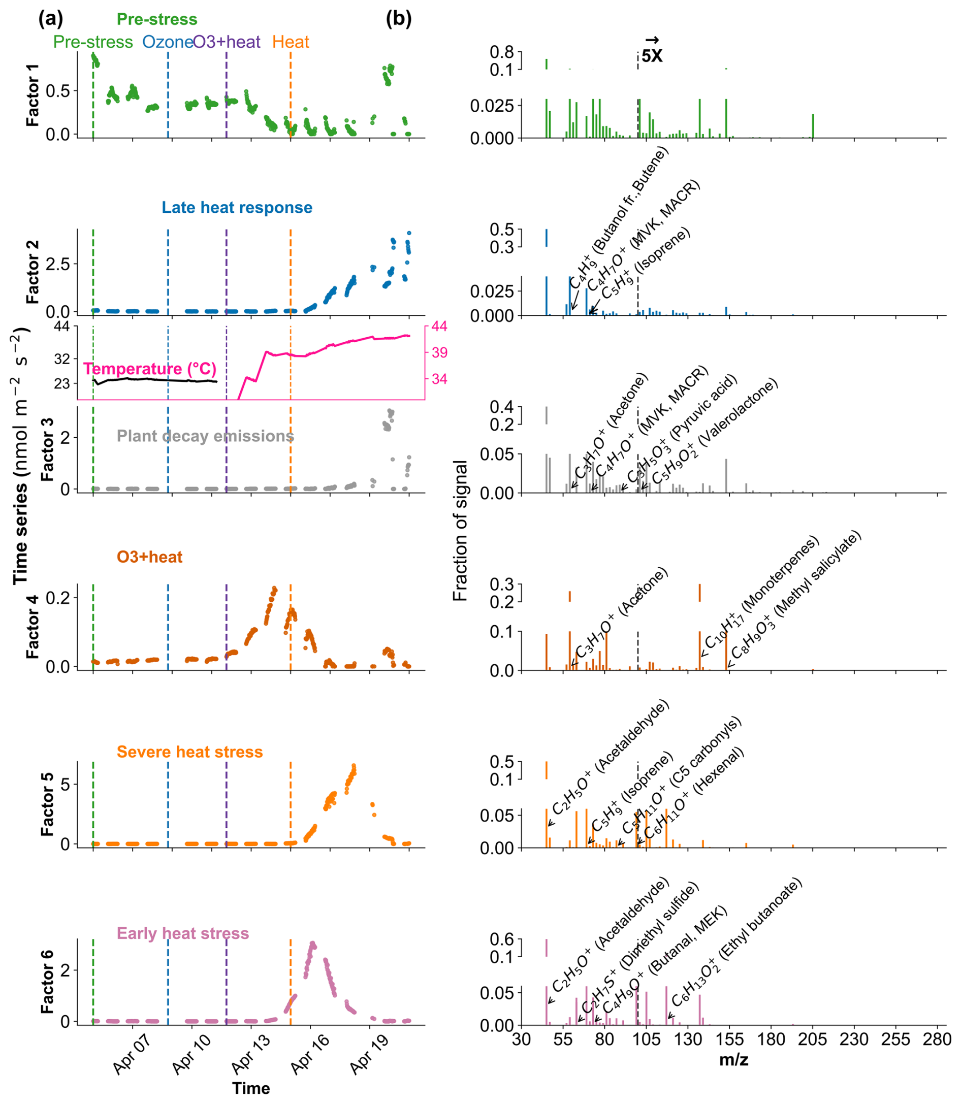 In parallel, PMF, an unsupervised source apportionment method, extracted latent emission profiles and their temporal dynamics. PMF resolved the VOC emissions into co-varying compound groups (factors) corresponding to physiological responses (e.g., early heat stress, oxidative damage, late heat stress, etc.). PMF and ML offer complementary perspectives: PMF elucidates temporal emission patterns, whereas ML identifies the most informative features for distinguishing stress types. The comparison between results from ML and PMF thus allows for higher certainty in fingerprint identification than one single method would provide.
