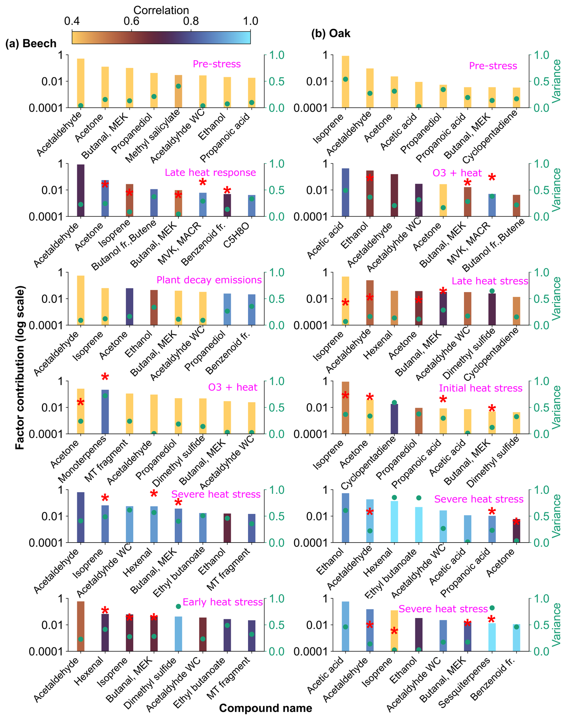 Emitted OH reactivity followed the same pattern as summed VOC emissions (Fig. 5), with the highest emitted OH reactivity under heat stress for both species. Summed calculated OH reactivity was higher in oak than beech emissions due to its higher BVOC emissions, especially of highly reactive isoprene.