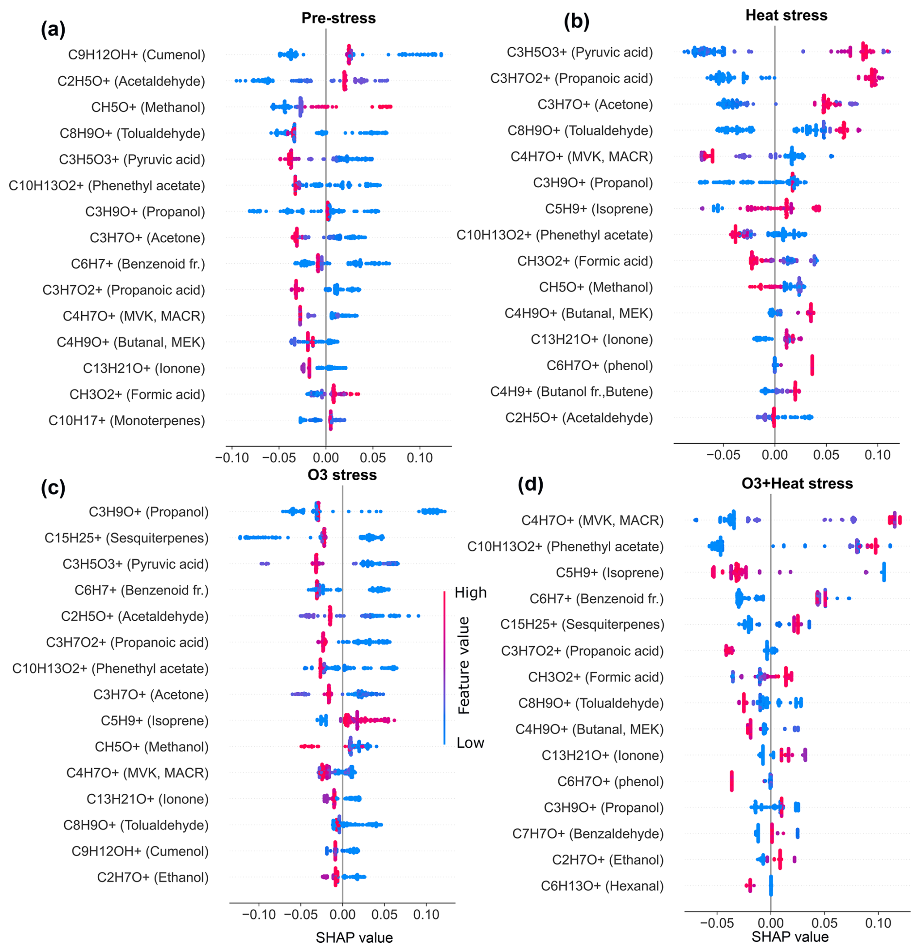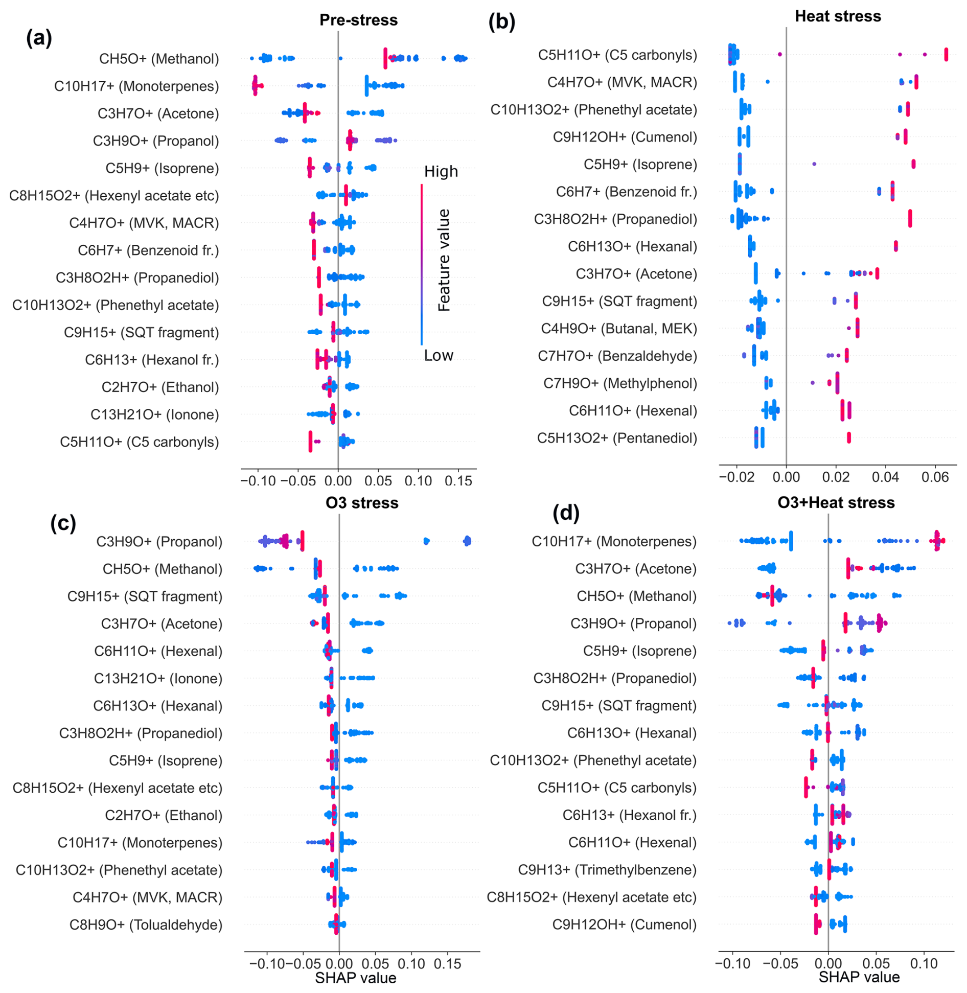 A supervised ML model classified four treatment categories: pre-stress, ozone stress (nighttime), heat stress, and ozone + heat stress, based on consecutive emission profiles. To interpret the model's decision-making process and identify the important features, SHapley Additive exPlanations (SHAP) were used. SHAP analysis enabled features or BVOC compound-level interpretability by indicating whether high or low emissions of individual VOCs contributed to specific stress classifications, thereby providing both directionality and diagnostic specificity.