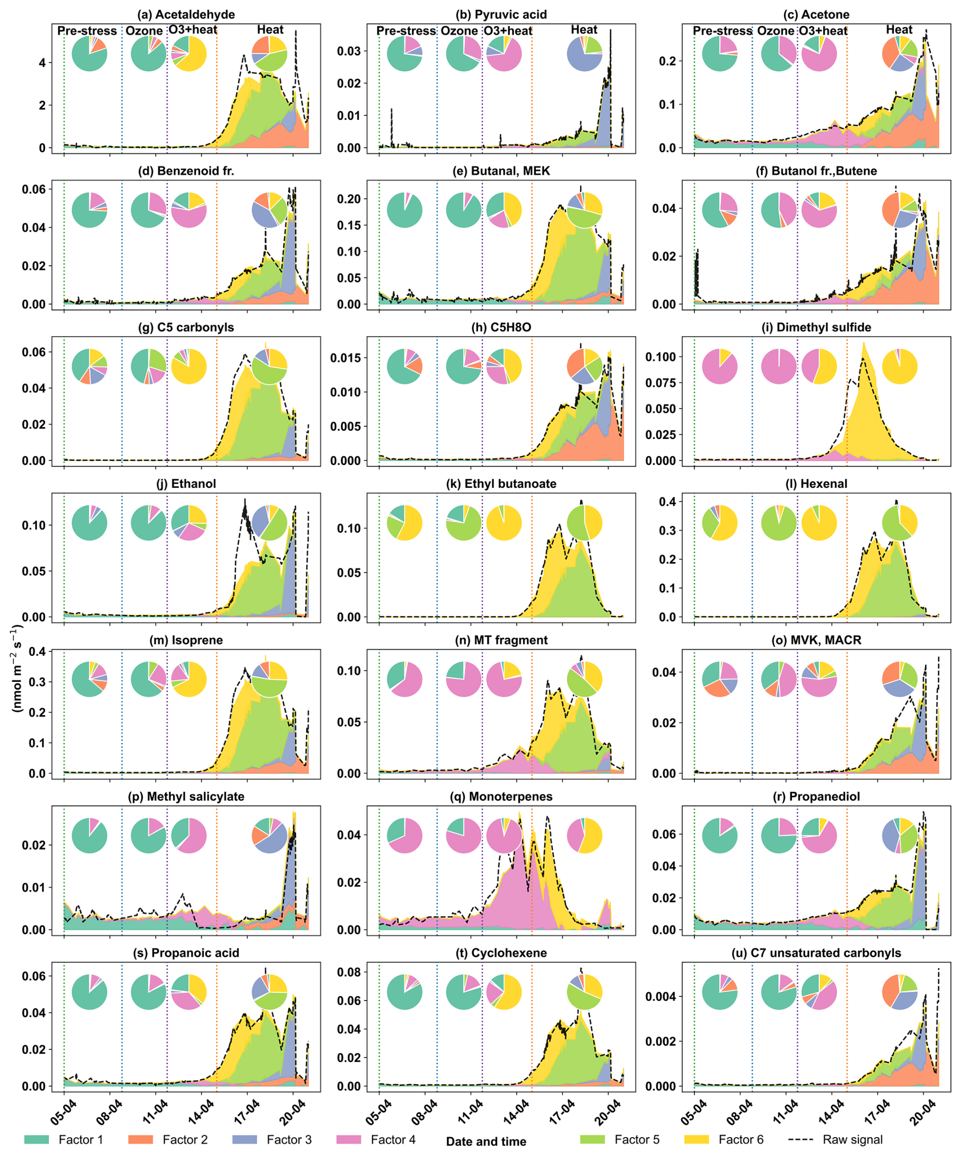 To cross-investigate the random forest outcomes, we performed PMF analysis on VOC species measured by the Vocus-PTR-ToF-MS. The PMF model was used to identify the VOC time series into factor profiles, factor time series, and residuals, thereby isolating characteristic stress-related emission patterns. The PMF model has been widely applied to identify different sources and chemical processes of VOCs measured by PTR-ToF-MS across anthropogenic to biogenic emissions (Bhattu et al., 2024; Gkatzelis et al., 2021; Song et al., 2024). The analysis was conducted separately for beech and oak using the Multi-linear Engine (ME-2) and implemented via the Source Finder (SoFi) package (version 8.6.4.4) with Igor-Pro software (version 9.05). The bilinear PMF model resolved the sample matrix into two non-negative matrices: factor profiles (F) representing characteristic mass spectra and factor contributions (G) representing the temporal evolution of each profile, with an associated residual matrix (E).