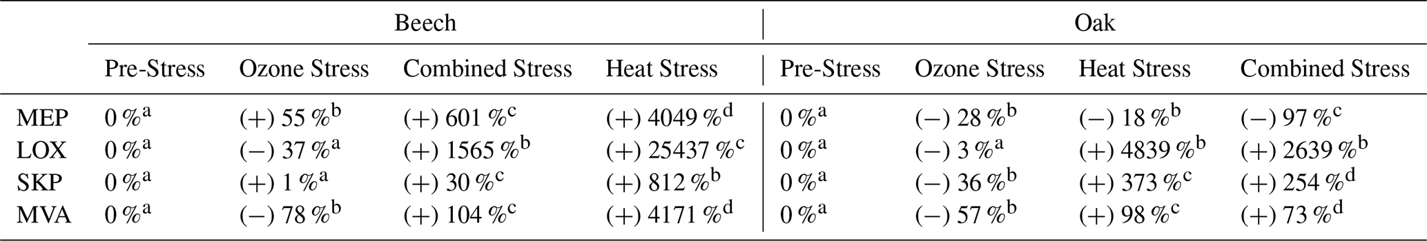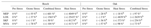 Table 1Percentage change in emission rates of volatile organic compounds under four biosynthetic pathways, MEP (Methylerythritol Phosphate), LOX (Lipoxygenase), SKP (Shikimate), and MVA (Mevalonate) in beech and oak for three stress conditions. Sign (+/−) indicate increases or decreases in emission relative to the pre-stress baseline (set at 0 %). Superscript letters (a–d) denote statistically significant differences within each row, with different letters indicating significant variation among stress events (p<0.05).