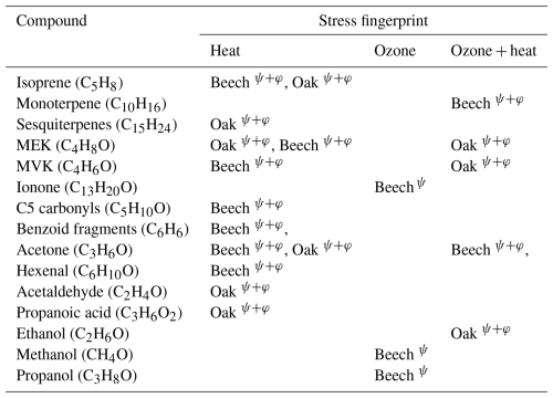 Heat stress and combined O3 + heat stress in beech induced emissions with a more diverse emission profile compared to O3 and pre-stress stress. The emission profile was dominated by alcohols and carbonyls, which together accounted for over 70 % of the total emissions and monoterpenes (10 %) (mole-based). Among the alcohols, methanol (CH5O+, 33.03), and ethanol (C2H7O+, 47.05) were the primary contributors, while acetaldehyde, and butanal/methyl ethyl ketone (MEK, C4H9O+, 73.06) were the main carbonyls. Monoterpenes (10 %) increased substantially under combined stress in beech. Oak emissions were consistently dominated by isoprene pre-stress (71 %), as well as under O3 (77 %), while contributions from alcohols, carbonyls and acids increased substantially under heat and combined stress. In oak, acetic (C2H5O, 61.02) and propanoic acids (C3H7O, 75.04) were the main contributor species of the acid fraction. Carbonyl and alcohol composition similar to that of beech. Both species diversified their emitted BVOC mixture under heat and combined stress compared to pre-stress conditions.