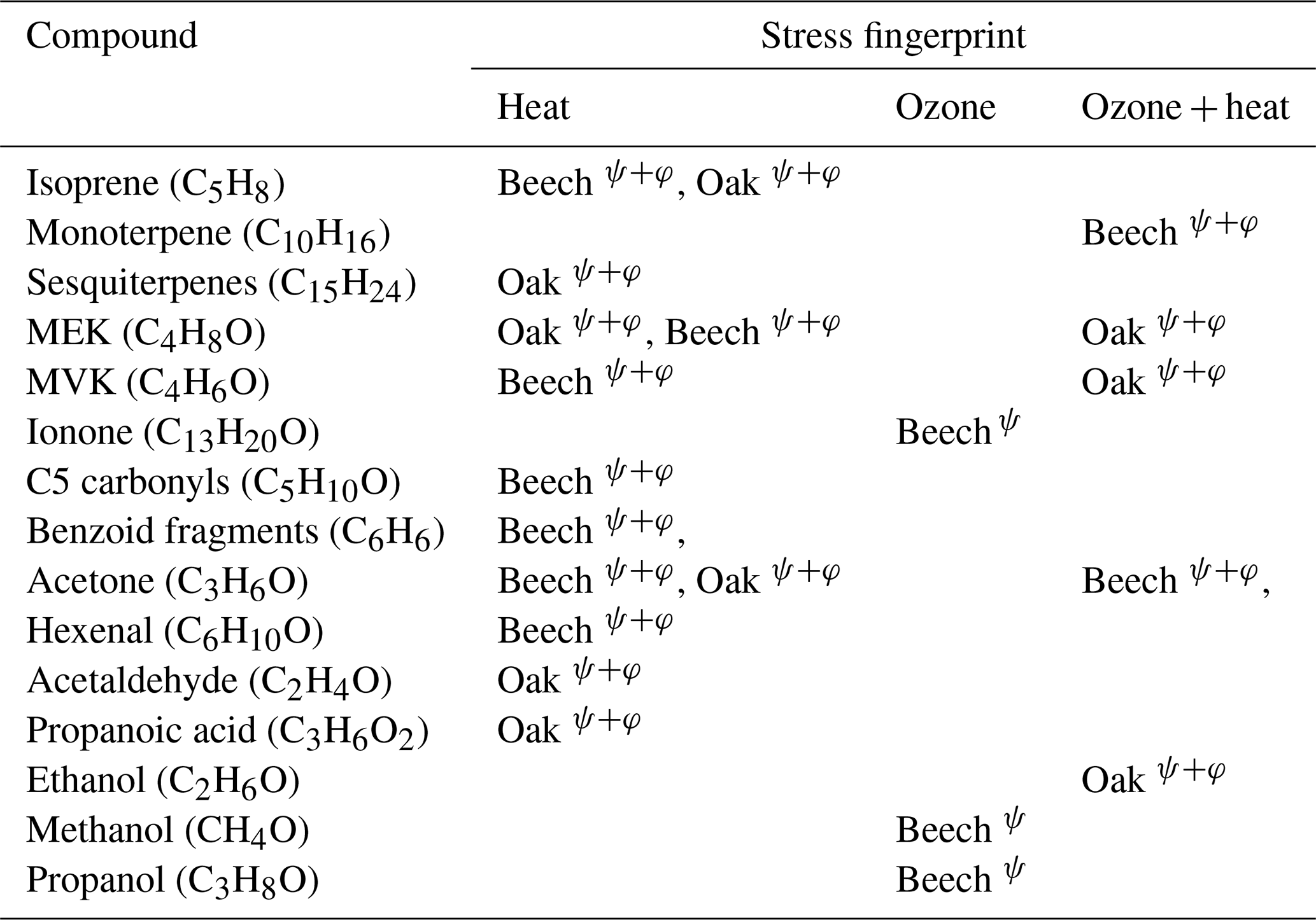 Therefore, this study specifically aimed (1) to investigate BVOC emission patterns from both tree species under heat or ozone and combined stress in controlled environmental conditions, (2) to identify specific stress marker BVOCs for beech and oak for the identification of stress-induced BVOC emissions in future field measurements, (3) to estimate the potential atmospheric impact of changing emission patterns in terms of OH reactivity as an indicator for ozone formation potential. We applied stressors sequentially on the same individuals to simulate realistic environmental stress storylines.