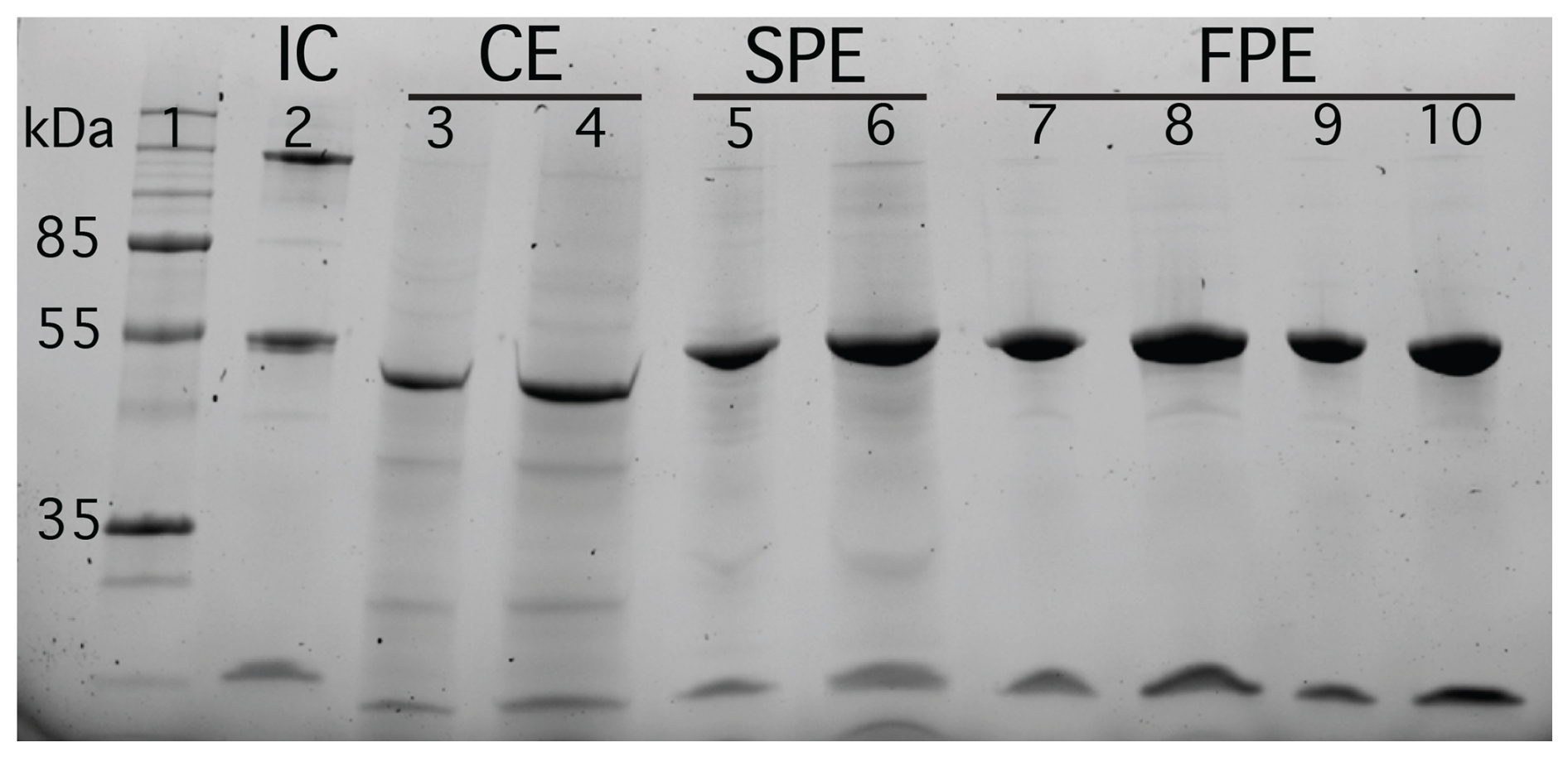 Figure 1Qualitative SDS-PAGE analysis of protein extracts from S. oleracea leaves purified for Rubisco using two different protocols: one for semi-purification and the other for full purification. Proteins were separated on an SDS-PAGE gel and stained with Coomassie Brilliant Blue. Lane 1: molecular weight marker; Lane 2: internal control (IC); Lanes 3–4: crude extract (CE); Lanes 5–6: semi-purified extract (SPE); Lanes 7–10: fully-purified extract (FPE). Prominent bands at approximately 55 and 14 kDa correspond to the large and small subunits of Rubisco, respectively.