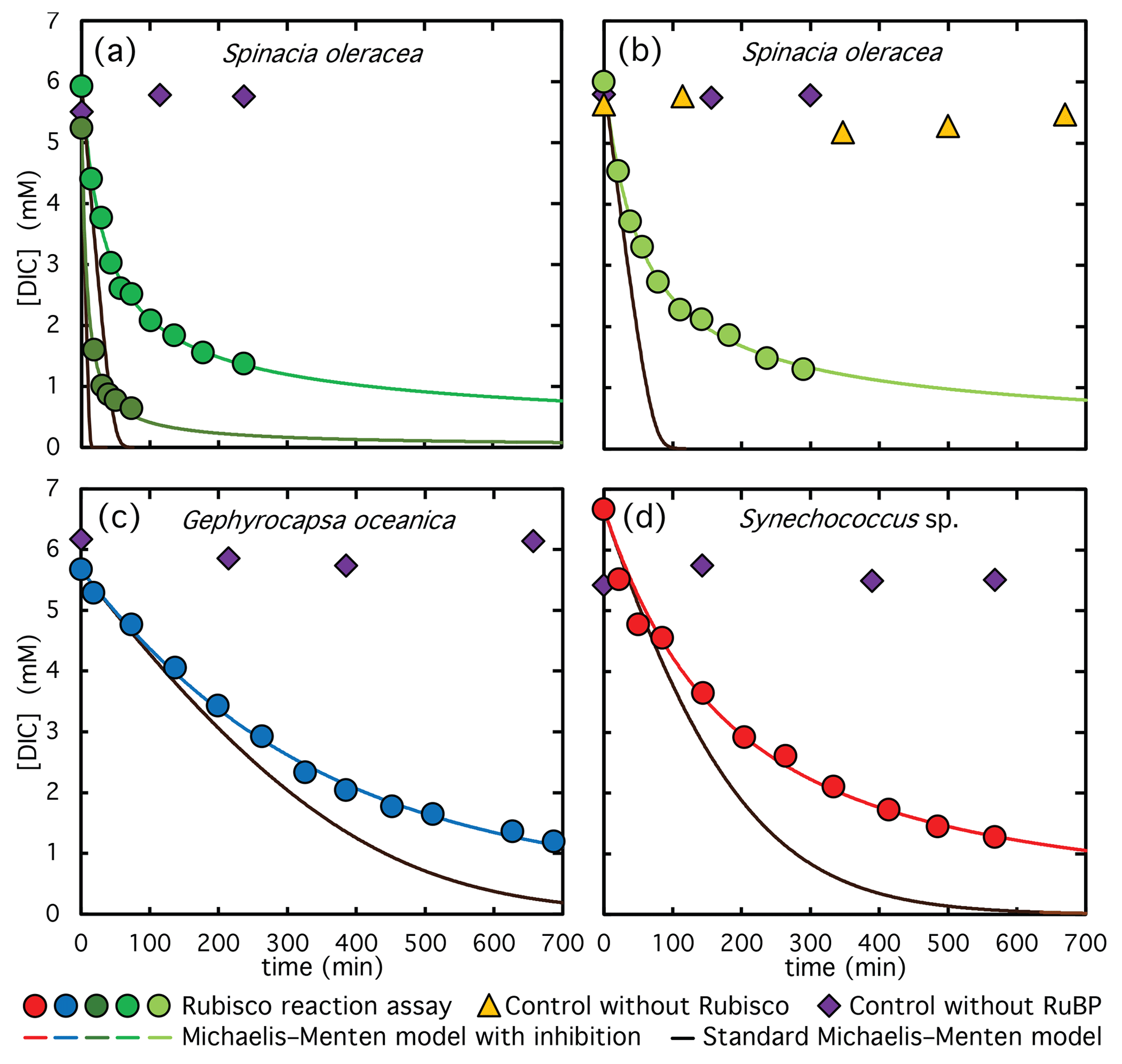 Figure 2DIC depletion during the course of CO2 fixation catalyzed by Rubisco from: (a) fully-purified S. oleracea extract, (b) semi-purified S. oleracea extract, (c) semi-purified G. oceanica extract, and (d) semi-purified Synechococcus sp. extract. Symbols represent measured DIC concentrations, lines represent modelled concentrations. Circles show DIC measurements from active reaction assays, violet diamonds represent control experiments without RuBP, and yellow triangles represent controls without Rubisco extract. Black lines correspond to fits using standard Michaelis-Menten kinetics, while the other lines incorporate competitive product inhibition by reaction by-products. Green and dark-green circles in panel (a) represent assays performed at two different Rubisco concentrations.