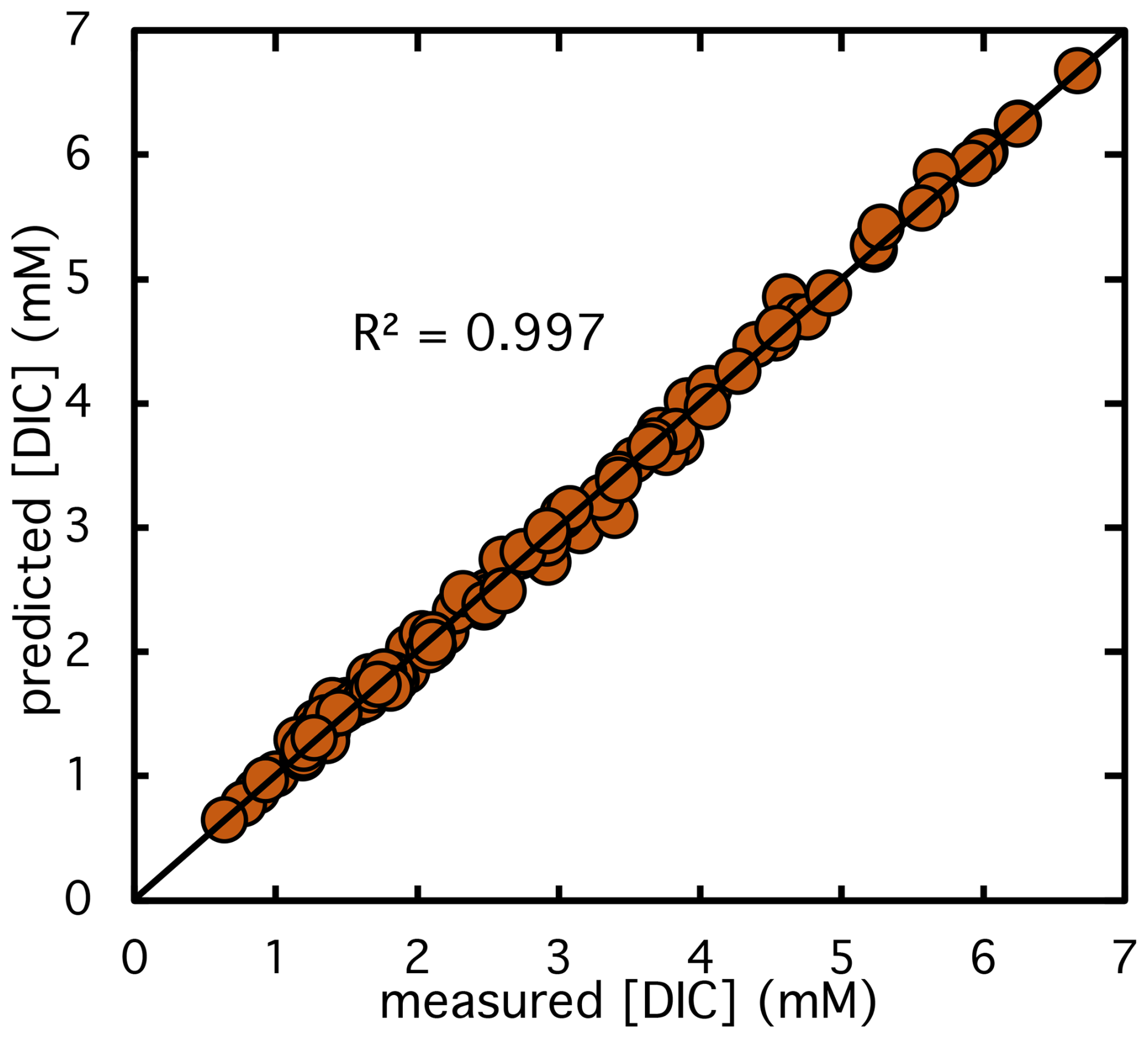 Two concentrations of in-house NaHCO3 isotope standards, prepared in both deionized water and 110 mM EPPS buffer, were analyzed at the beginning and end of each run to monitor instrument accuracy and correct for any drift. The average standard deviation of these standards was 0.2 ‰. Additionally, a certified DIC reference material from the Scripps Institution of Oceanography (Dickson, 2010) was injected at multiple concentrations to calibrate the quantitative DIC measurements. The EPPS buffer used to dilute the samples was analyzed repeatedly as a blank. Although it was degassed by bubbling with N2 overnight, trace amounts of DIC were still detectable and were subtracted from measured sample concentrations.
