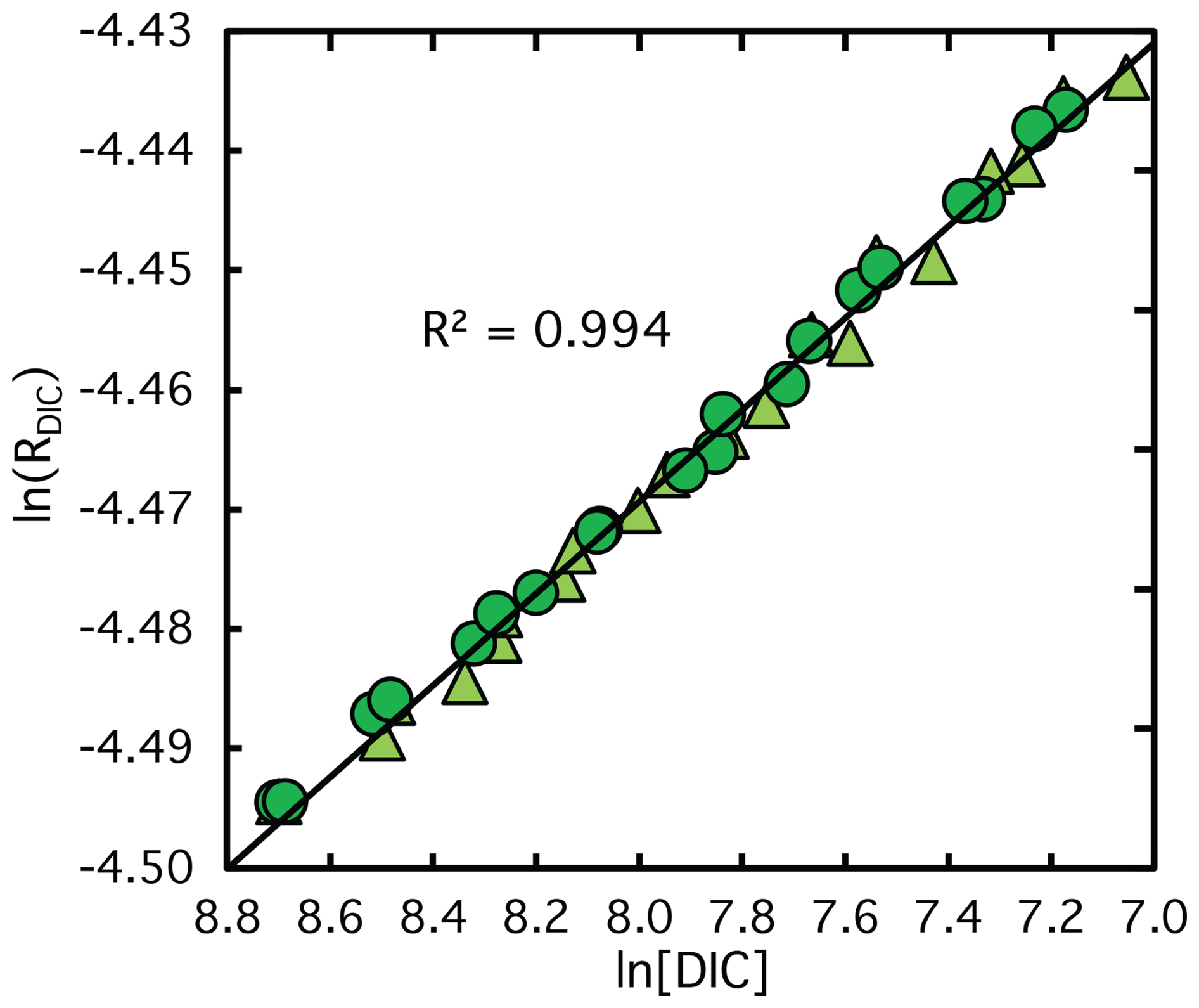 Figure 5Log–log plot of the carbon isotope ratio (lnRDIC) versus the natural logarithm of the remaining DIC concentration during CO2 fixation catalyzed by Rubisco from semi-purified (light green triangles) and fully-purified (green circles) S. oleracea. Data represent all replicate experiments. Linear regressions indicate no significant difference in isotope fractionation between the semi-purified and fully-purified Rubisco extracts.