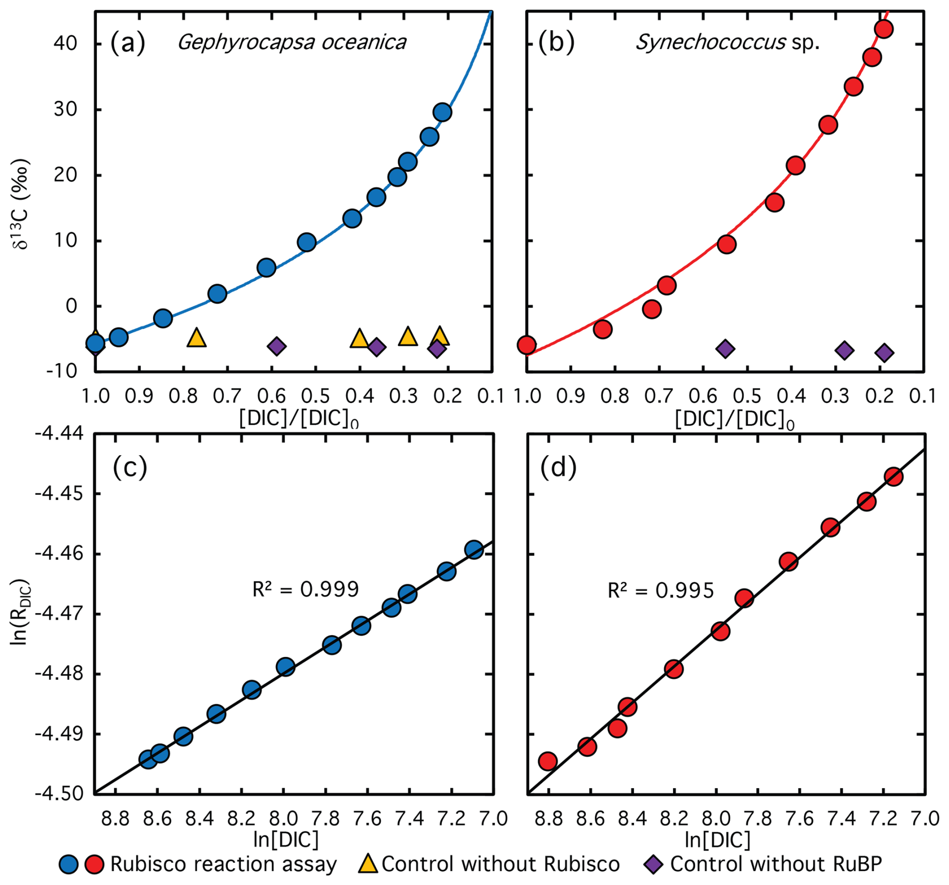 Figure 6Measured (symbols) and calculated (lines) δ13C values of DIC plotted against the remaining DIC fraction during CO2 fixation catalyzed by Rubisco from G. oceanica (a) and Synechococcus sp. The corresponding logarithmically linearized plots with fitted lines used to calculate ϵRubisco values are shown in panels (c) and (d). Violet diamonds and yellow triangles indicate data from control experiments lacking RuBP and Rubisco extract, respectively. Note that no DIC was consumed in these control assays, the x-axis values reflect sampling time rather than the remaining DIC fraction, illustrating the stability of the carbon isotope composition over the course of the reaction.