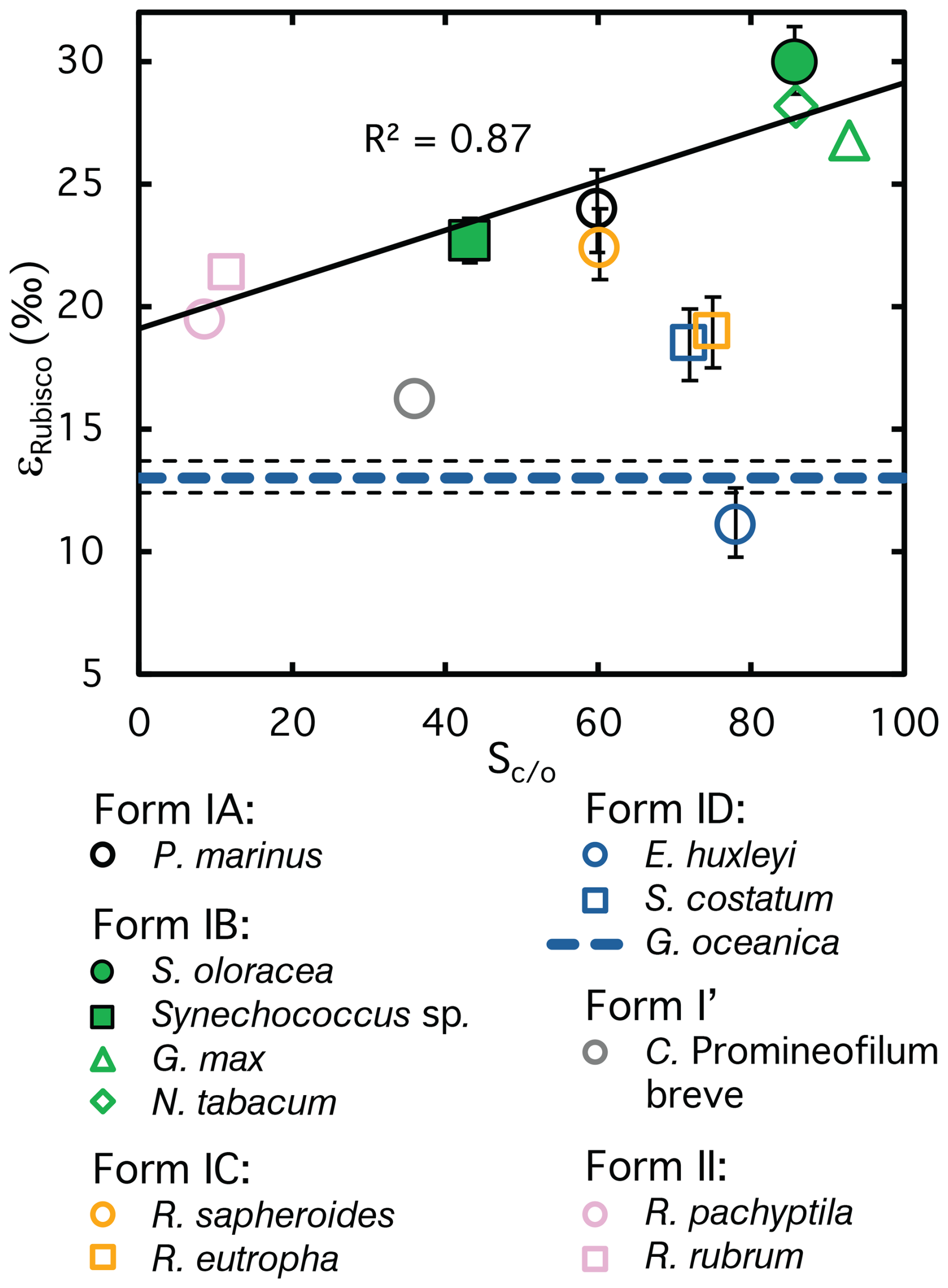 Figure 7Isotope fractionation (ϵRubisco) versus CO2/O2 selectivity (Sc/o) of Rubisco for species where both parameters have been reported. A positive correlation is evident for Forms IA, IB, and II, which fall along a common trend line, suggesting that ϵRubisco and Sc/o may be linked in these groups. By contrast, Forms IC and ID deviate from this relationship, indicating that no universal correlation exists across all Rubisco lineages. Error bars represent 95 % confidence intervals where available. Full symbols highlight the ϵRubisco values measured in this study. The coccolithophore G. oceanica, for which Sc/o is unknown, is represented by a dashed line ±95 % confidence interval. References for ϵRubisco and Sc/o are listed in Table A1.