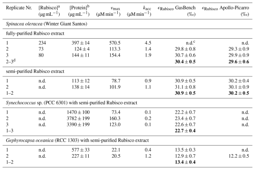 a active Rubisco concentration determined using the 14C-CABP binding method (Aguiló Nicolau et al., 2025). b Total protein concentration measured using the Bradford assay (Bradford, 1976). c n.d. = not determined. d Indicates which replicates were used to calculate ϵRubisco using the Pitman estimator.