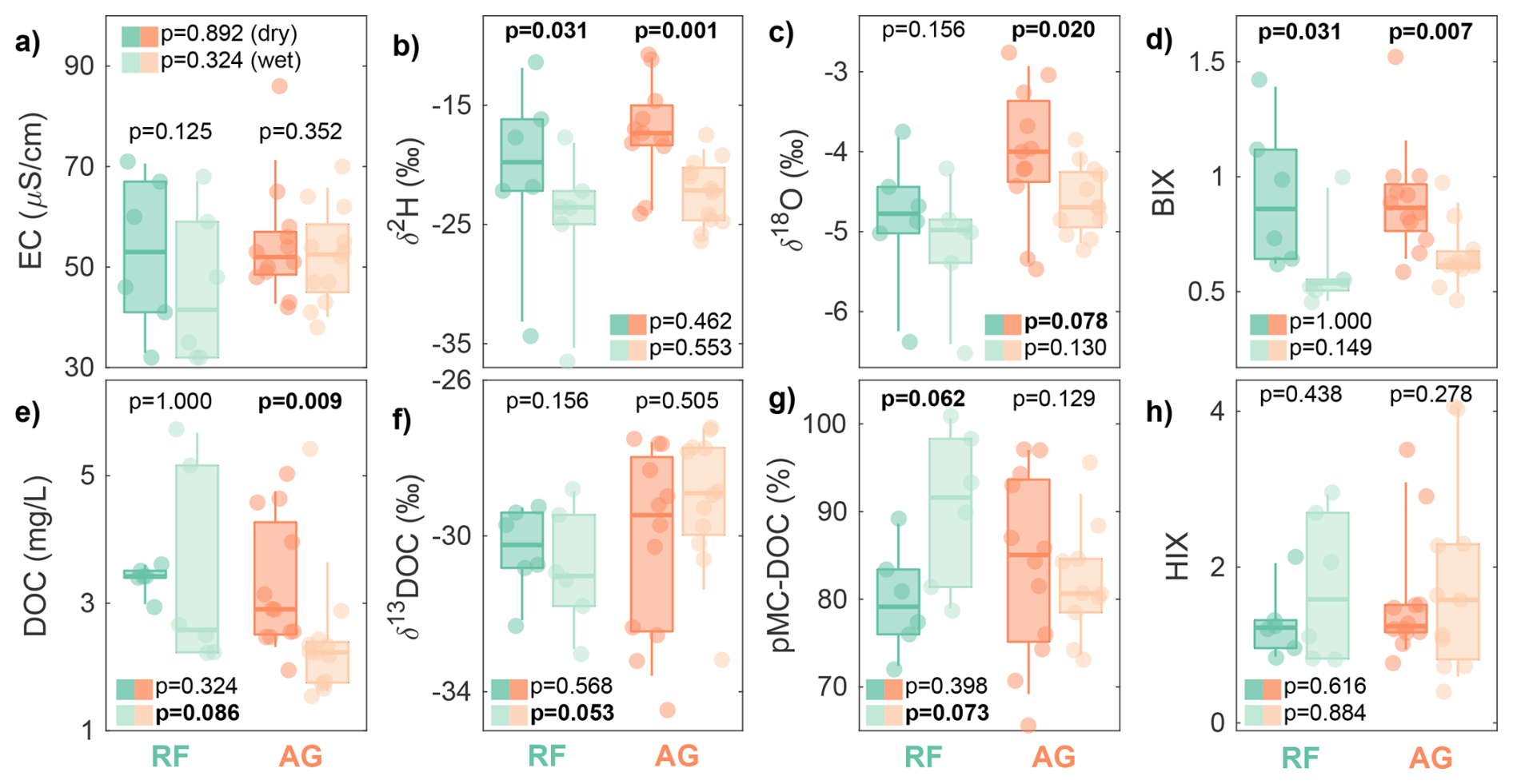 Figure 2Distribution of variables between the dry (dark) and wet (light) seasons across rainforest (RF; green) and agricultural (AG; orange) sites. Variables are (a) electrical conductivity (EC), (b, c) stable isotopes of hydrogen and oxygen in water (δ2H and δ18O), (d) biological index (BIX), (e) DOC, (f) δ13C-DOC, (g) 14C-DOC in percent Modern C (pMC), and (h) humification index (HIX). The p values at the top of each boxplot pair represent the seasonal differences within the same land use category based on Wilcoxon signed-rank tests. The p values next to the coloured boxes represent the differences between land use categories for the dry (dark) and wet (light) seasons based on Mann-Whitney U-tests. Given the small sample sizes, p values lower than 0.1 were considered indicative of a significant difference and are shown in bold.