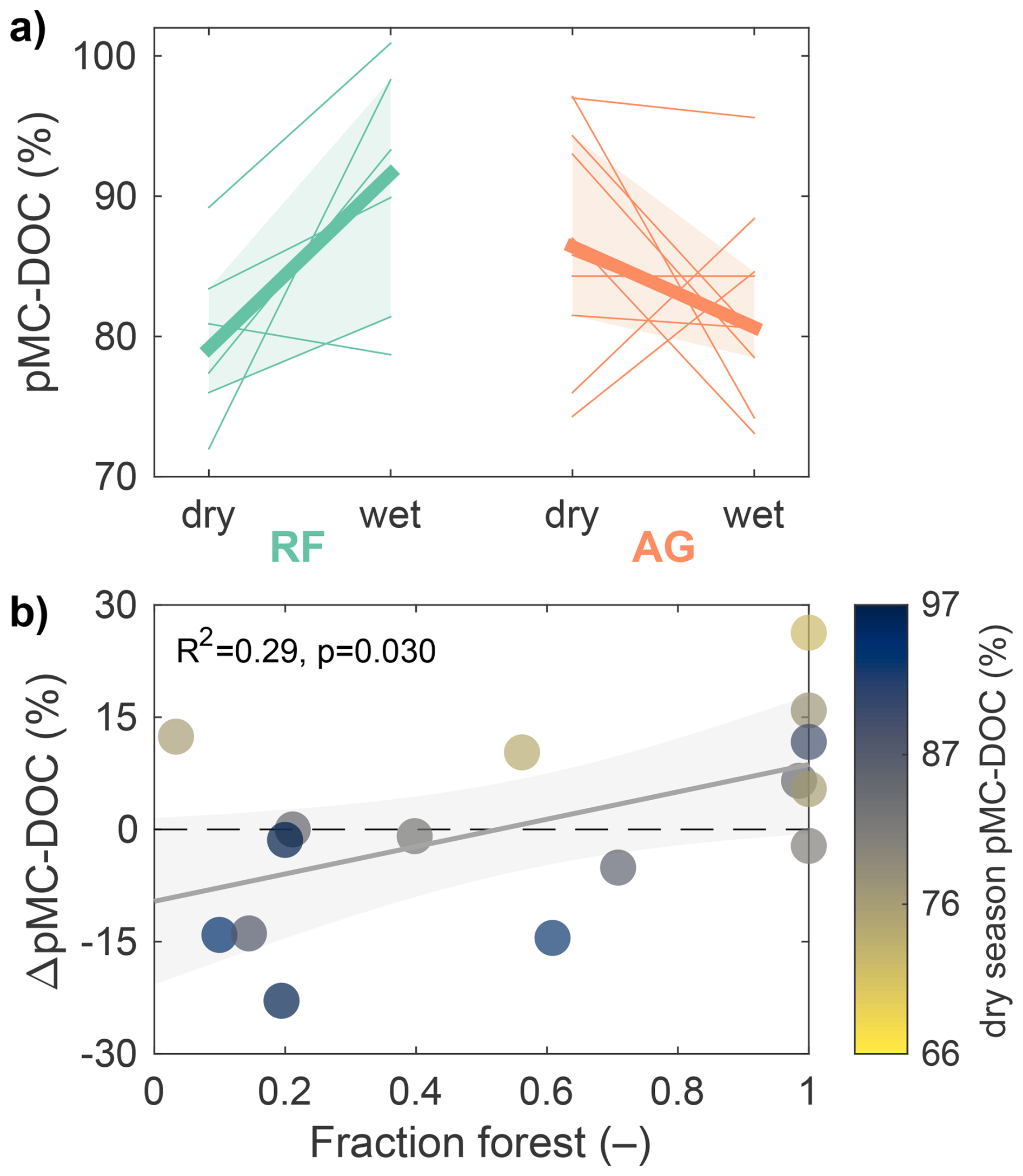 Figure 3Seasonal changes in percent modern C (pMC) in dissolved organic carbon (DOC). (a) Changes in pMC-DOC for the six rainforest (RF) sites and ten agricultural (AG) sites. The thick lines and shaded areas represent the median and interquartile range across all sites. (b) Relationship between seasonal change in pMC from dry to wet seasons (ΔpMC-DOC; positive = younger DOC in the wet season) and fraction of forest cover. All six rainforest sites plot to the right around 1. In the upper plot, the seasonal change in rainforest sites (p=0.062) and the difference between the two land use categories during the wet season (p=0.073; Fig. 2) are significant at a 90 % confidence level, whereas the other temporal and cross-category changes are not.