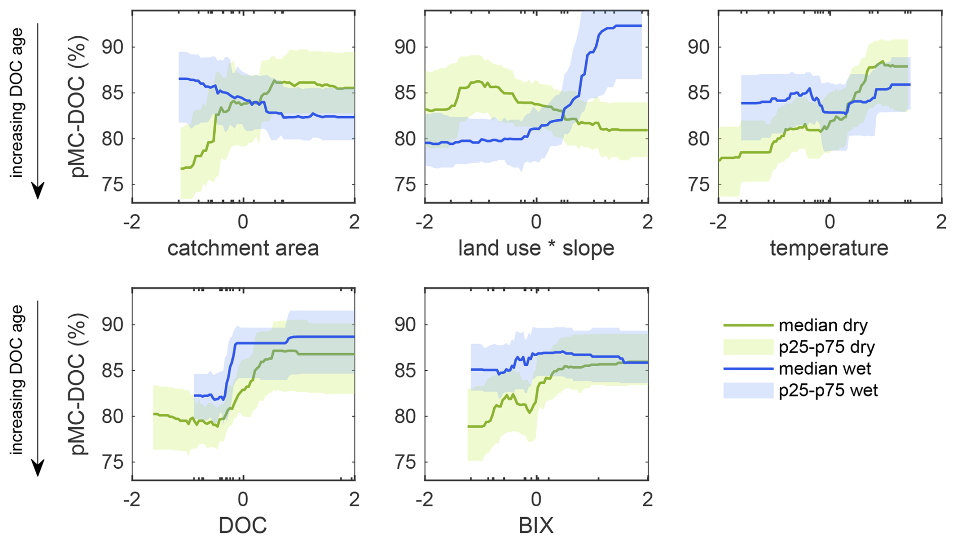 The GAM approach provided additional insight that was not detectable using simple linear relationships. We found that the drivers of variation and relationships with DOC age differed strongly between seasons (Fig. 4). In the dry season, catchment area, water temperature, DOC concentration and BIX were positively correlated with pMC-DOC, indicating that higher values of these variables were associated with younger DOC, while land use ⋅ slope was negatively correlated with pMC-DOC. In the wet season, the most significant drivers were land use ⋅ slope and DOC concentration, all positively correlated with pMC-DOC, while catchment area was negatively correlated with pMC-DOC. While the two land use categories explained significant differences in DOC age in the wet season only (Fig. 2), the GAM results indicate that the interaction between slope and land use was a strong driver of pMC-DOC in both seasons. Models that treated land use and slope as separate predictors resulted in higher AIC values (−392 and −341 for the dry and wet seasons, respectively) compared to GAMs that included the land use ⋅ slope interaction (AICs of −395 and −345 for the dry and wet seasons, respectively), suggesting that the interaction term improved model performance.