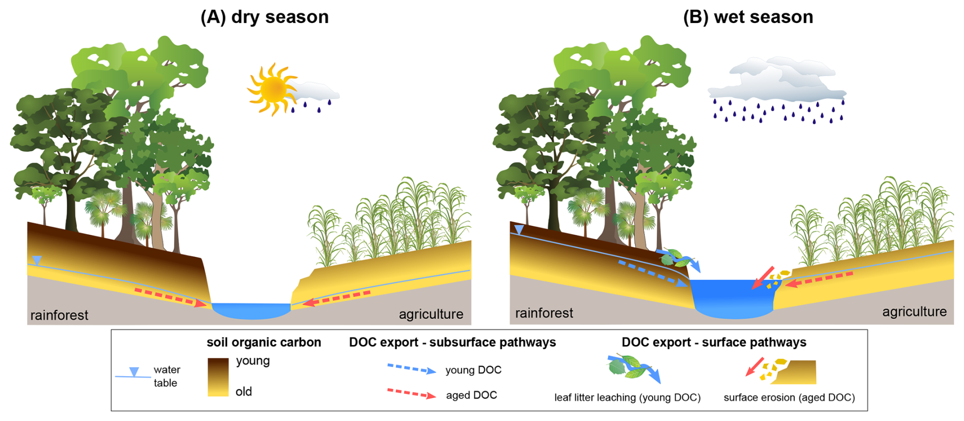 Figure 6Conceptual diagram showing the shift in DOC sources between the (A) dry and (B) wet seasons in rainforest versus agricultural catchments.
