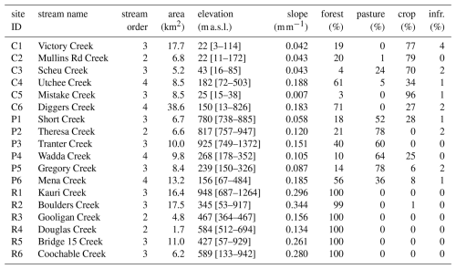 Samples were collected in six streams that drain relatively pristine rainforest remnants (R1 to R6) and 12 streams that drain some degree of agriculturally disturbed land, including six with land converted to pasture (P1 to P6) and six with cropland (mostly sugarcane and banana plantations; C1 to C6) (Fig. 1). Some of the agricultural sites drain a mixture of different land uses (i.e., forested area, agricultural area (pasture/crops) and urban area; Table 1). However, urban land use remains below 4 % at all sites. The six rainforest sites are generally located in more rugged terrain, resulting in higher mean catchment slopes (0.25 m m−1) compared to the 12 disturbed sites (0.11 m m−1) (p=0.005; Mann-Whitney U-test). Streams range from second to fourth order, and while the extent of groundwater connection is unknown, it is likely that all streams receive some level of shallow groundwater inputs.
