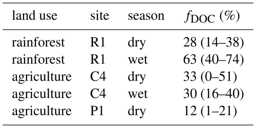 The DIC samples collected at three sites were modern or close to modern, with mean values of 97.1 pMC (R1), 98.5 pMC (C4) and 100.4 pMC (P1). Values slightly increased (i.e. DIC became younger) in the wet season at R1 and P1, whereas they decreased at C4. DIC was always younger than DOC, and at each site the DIC and DOC ages shifted in the same direction between seasons, although the direction of change differed between sites (Fig. 5). At the rainforest site (R1), both DIC and DOC were younger in the wet season, whereas at the agricultural site (C4), both were older in the wet season. Unfortunately, the wet season 14C-DOC sample from the third site (P1) was damaged during the analysis, so we have no DOC age data to compare the wet season 14C-DIC sample to. Using our simple endmember analysis, we estimated that between 12 % (1–21) and 63 % (40–74) (mean across sites and seasons: 33 %) of DIC might have originated from in-stream mineralisation of DOC, with the rest likely originating from soil CO2 (Table 2).