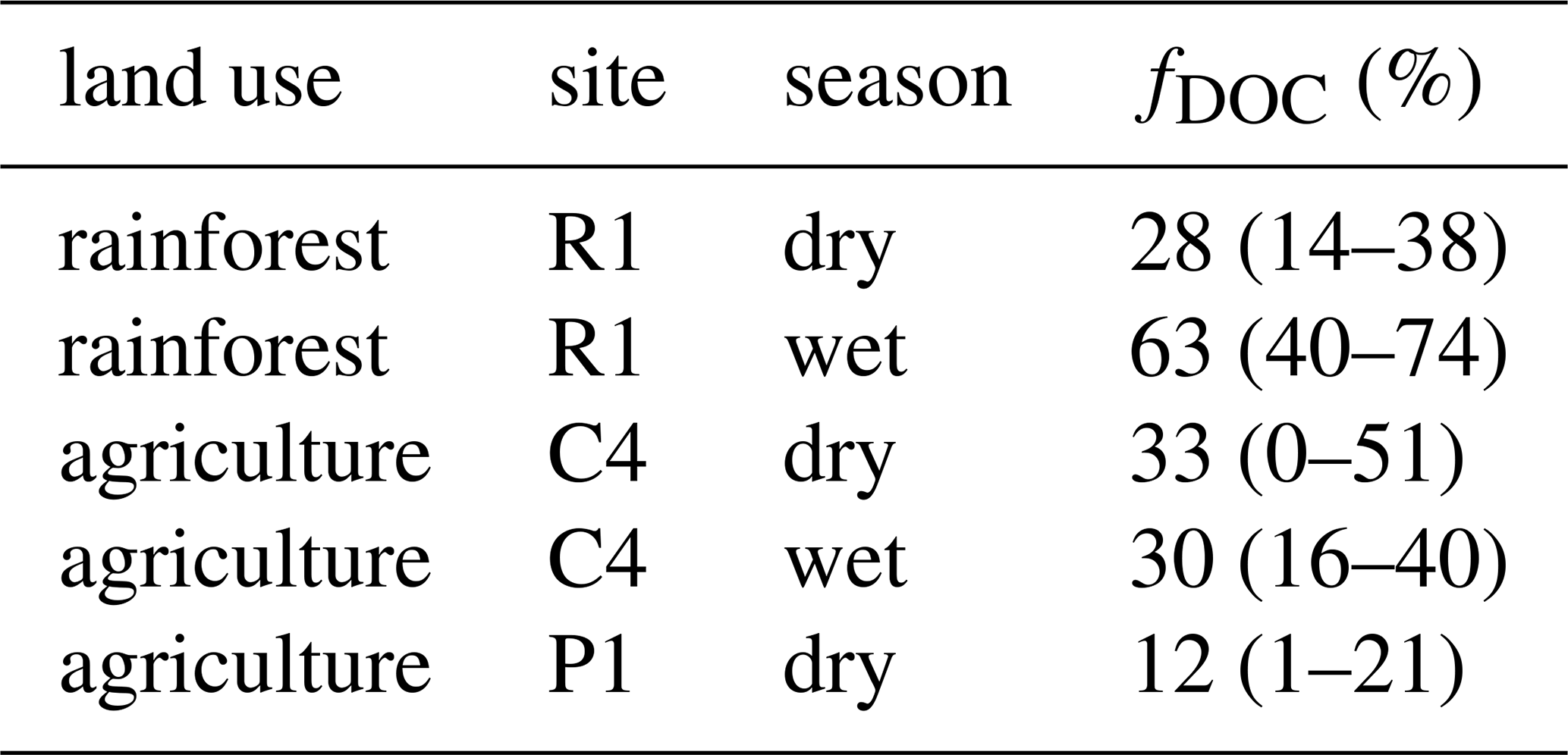 Uncertainty in fDOC was estimated for each site and season by propagating the uncertainty in Csoil, using its upper and lower bounds to generate corresponding bounds in fDOC. This simple approach provided only first-order estimates of the sources of stream DIC, because 14C-DOC likely represents an older, less labile fraction of DOC, which could result in underestimations of fDOC. However, the low HIX values (0.4–4.1) measured across all sites (see Results) indicate a predominance of highly biolabile DOM, suggesting that our mixing model provided coarse yet reliable results.
