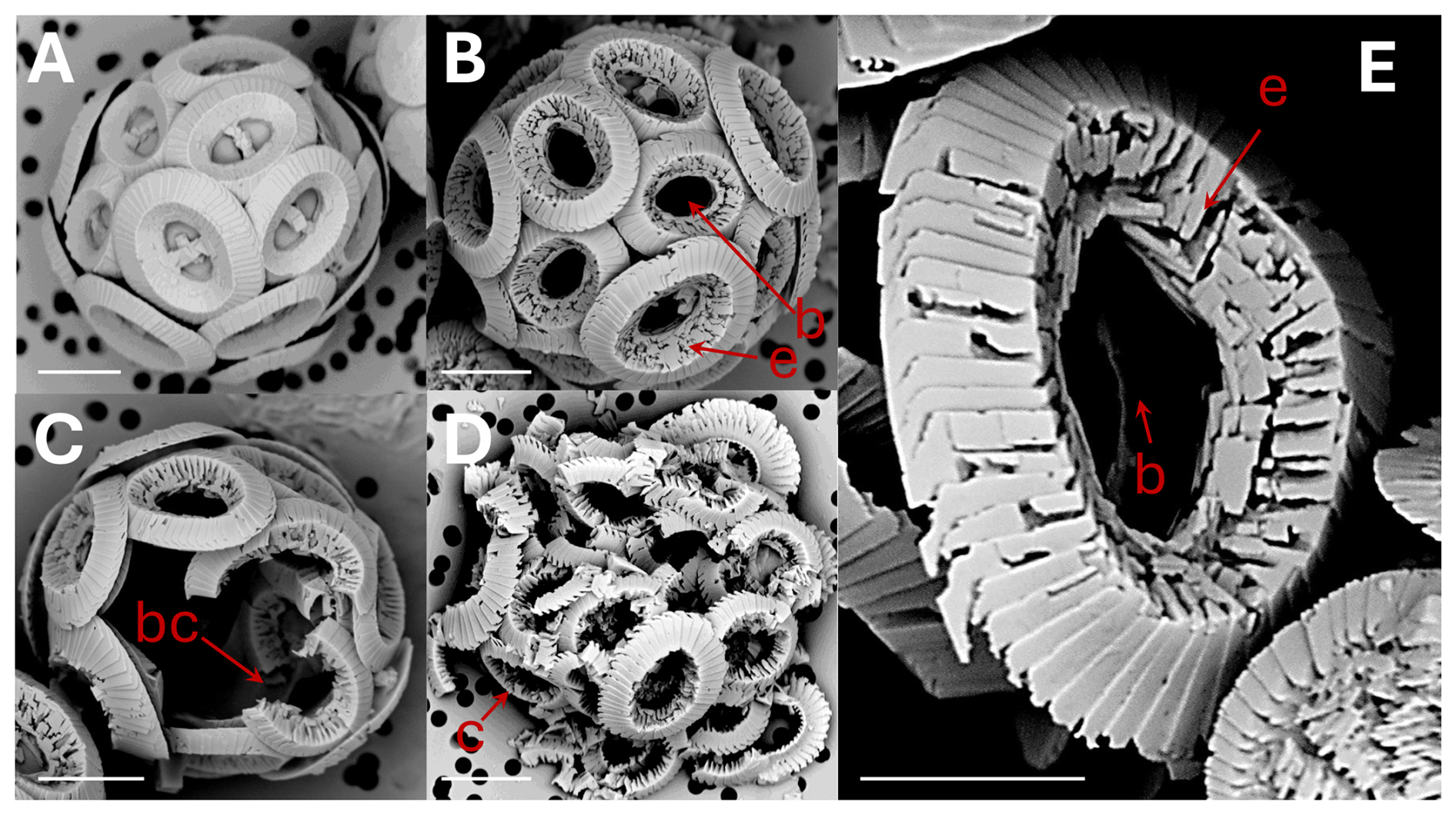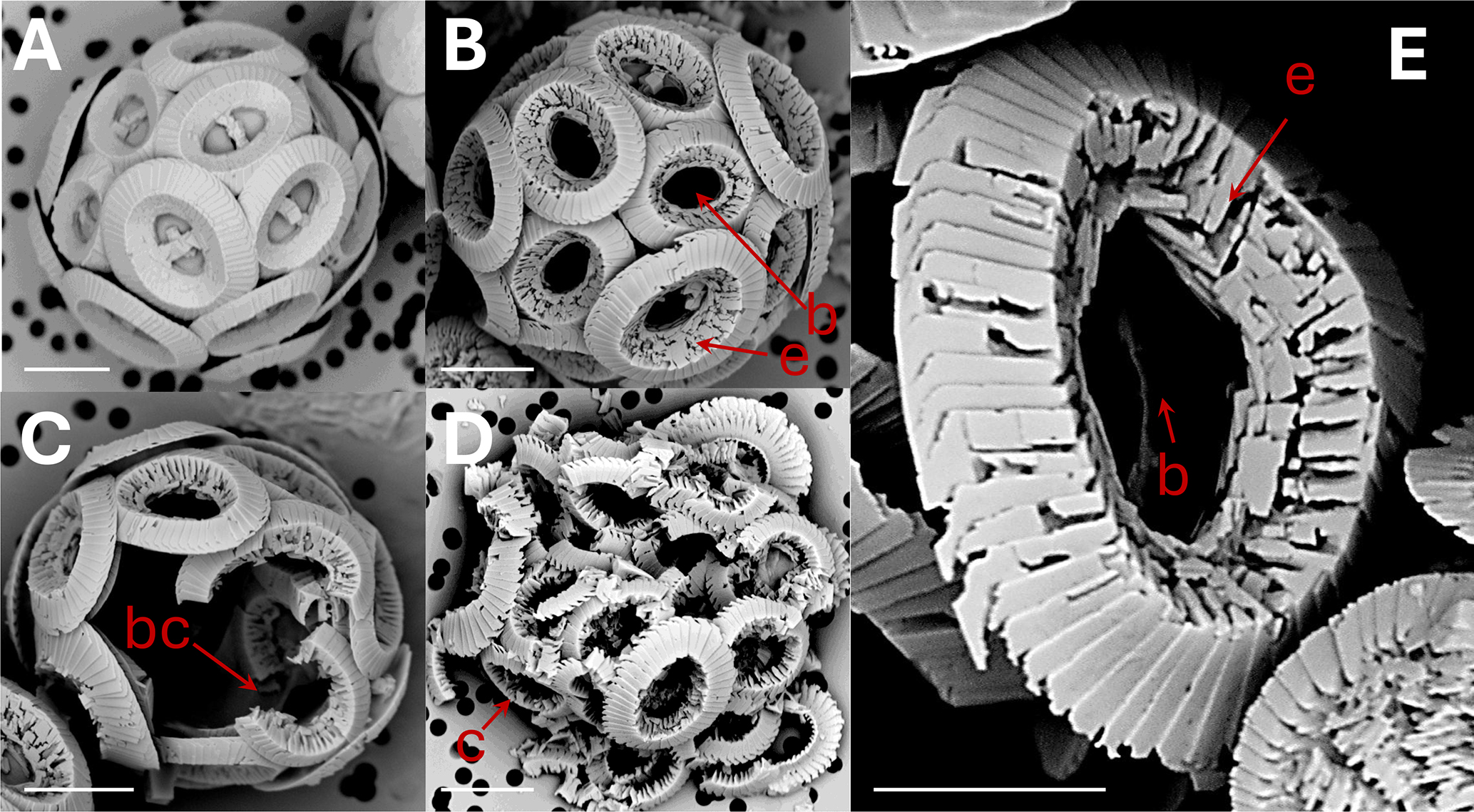 Figure 1Coccolithus braarudii: (A) coccosphere at t0, no dissolution. Scale bar 5 µm. (B) coccosphere; etching (e) of tube and distal shield and central area bar missing (b). Scale bar 5 µm. (C) broken coccoliths (bc), etching of tube, central bar missing and gaps in coccosphere. Scale bar 5 µm. (D) collapsed coccosphere (c), also showing etching (e) of tube and distal shield and central area bar missing (b). Scale bar 5 µm. (E) coccolith, etching (e) of tube and distal shield, and central area bar missing (b). Note that the etching consistently occurs by opening of sutures between elements rather than by dissolution of element surfaces. Scale bar 3 µm.
