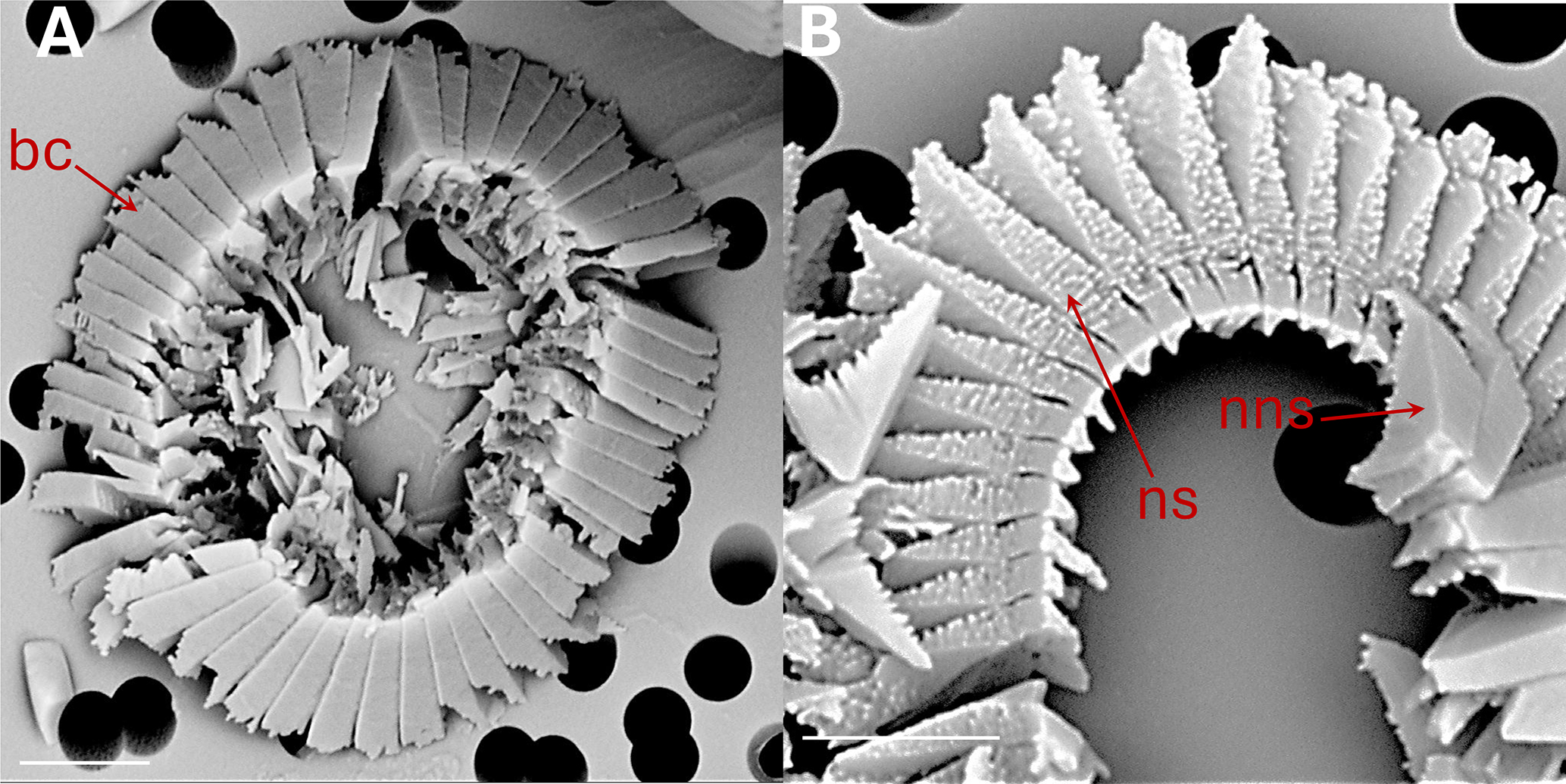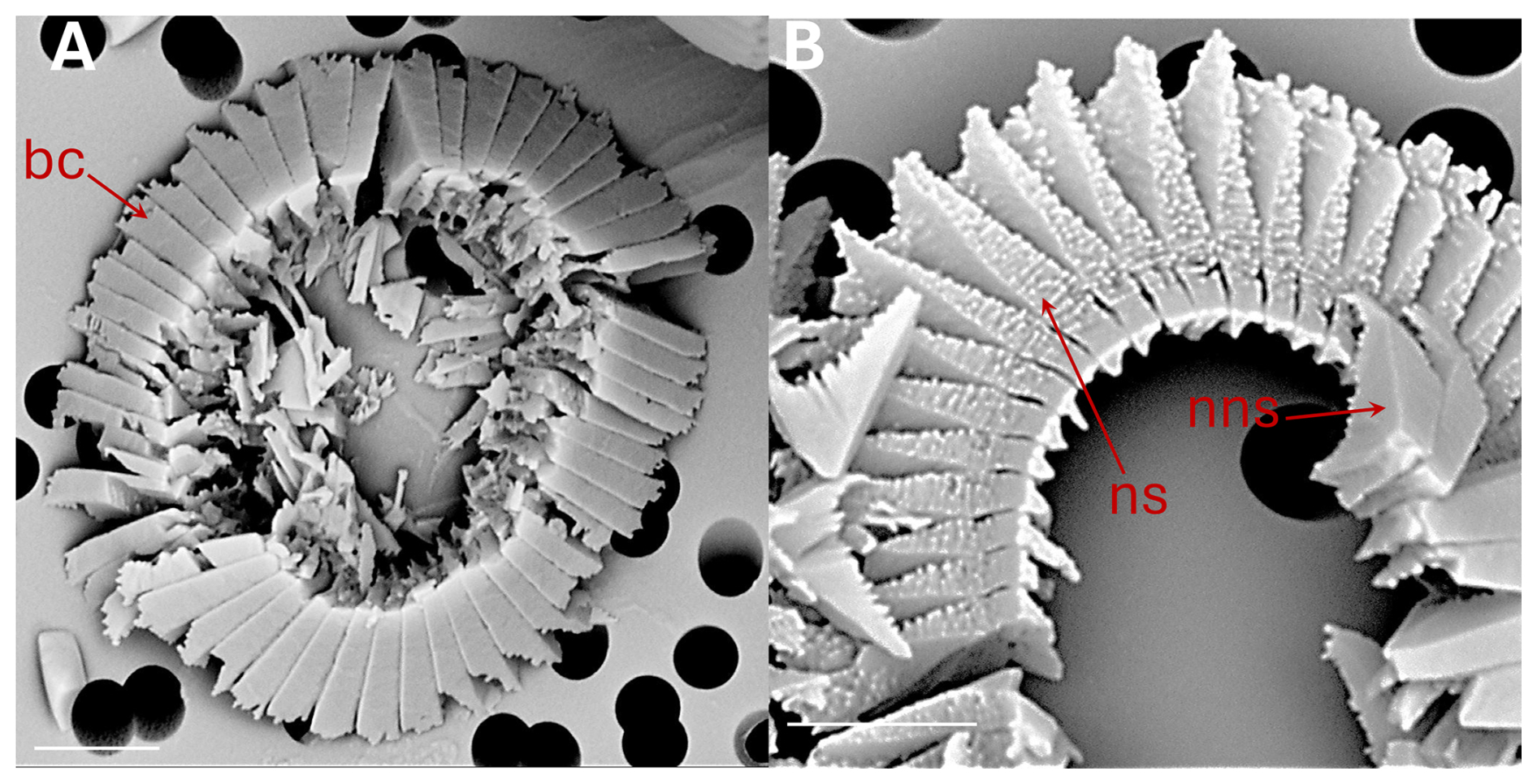 Figure 2Coccolithus braarudii: (A) broken coccolith (bc) distal shield in distal view. (B) broken coccolith proximal view of distal shield showing nanostructure (ns); the arrow indicates isolated distal shield elements in distal view, from another coccolith, not displaying nanostructure (nns) on distal and vertical surfaces. All scale bars 2 µm.