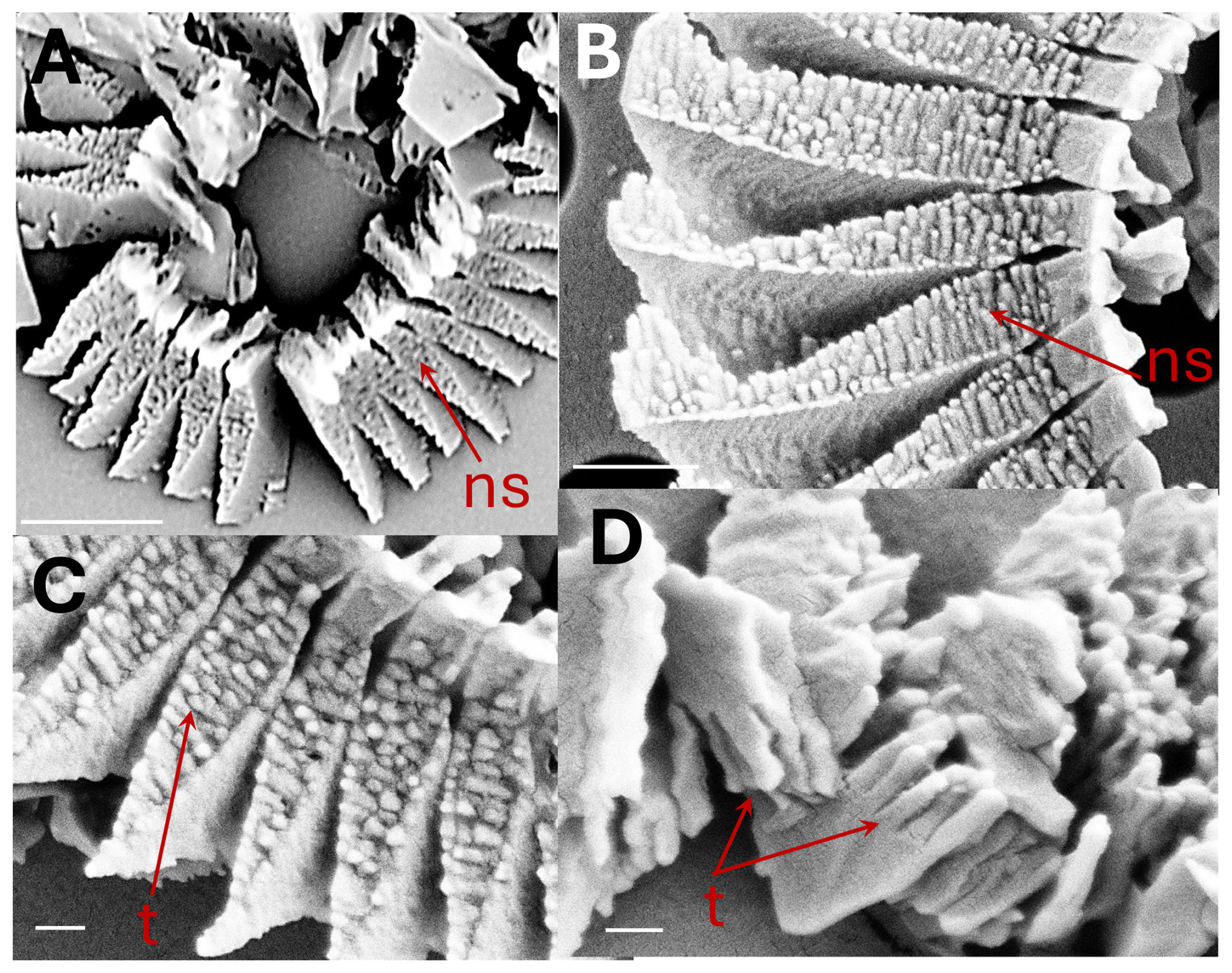 Figure 3Coccolithus braarudii: (A) broken coccolith distal shield in proximal view showing nanostructure (ns). Scale bar 2 µm (B) proximal view of distal shield elements showing nanostructure (ns). Scale bar 500 nm. (C) proximal view of distal shield elements showing nanostructure (ns); individual “tubercles” (t) of the nanostructure are ca. 50–100 nm, Scale bar 200 nm. (D) isolated distal shield elements showing nanostructure “tubercles” (t) in vertical side view (arrow). Scale bar 200 nm.