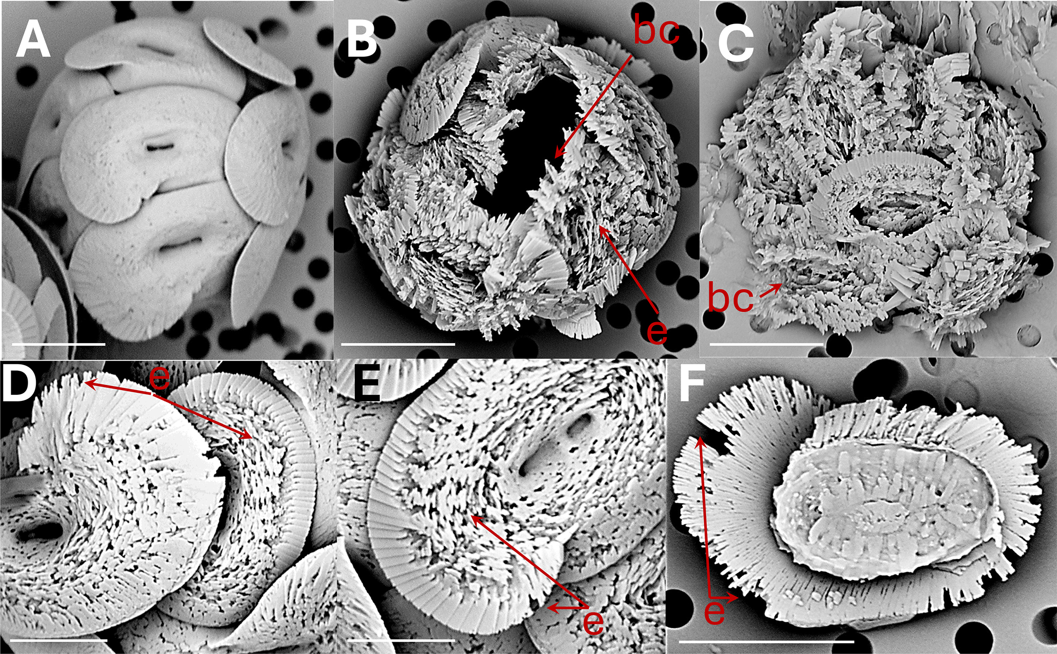 Figure 4Helicosphaera carteri: (A) coccosphere at t0, no dissolution. Scale bar 5 µm. (B) coccosphere displaying coccoliths with severe etching (e) and a broken coccolith (bc). Scale bar 5 µm. (C) collapsed coccosphere including broken coccoliths (bc). Scale bar 5 µm. (D) coccoliths in distal view with etching (e) in flange and blanket. Scale bar 3 µm. (E) coccolith in distal view with etching in flange and blanket. Scale bar 2 µm. (F) coccolith in proximal view with etching (e) in flange. Scale bar 5 µm.