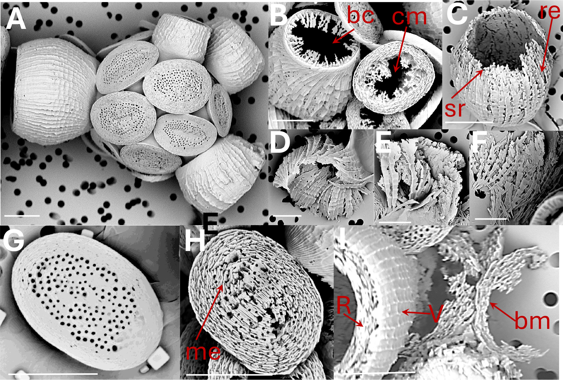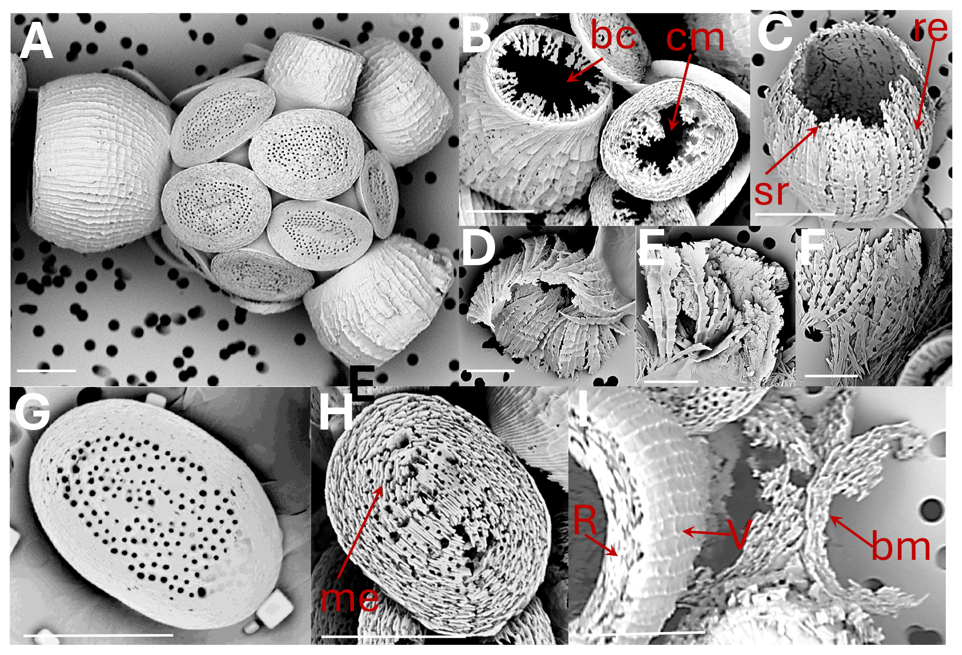 Figure 5Scyphosphaera apsteinii: (A) coccosphere at t0, no dissolution (B) lopadolith base etching (be); murolith centre missing (cm) (C) lopadolith barrel etching (re) and serrated rim (sr) (D) and (E) broken lopadoliths (F) isolated V-units (G) murolith at t0, no dissolution (H) murolith with etching (me) (I) lopadolith in distal view showing R- and V-units (R- and V arrows, Young, 2008); and broken murolith (bm). All scale bars 5 µm.